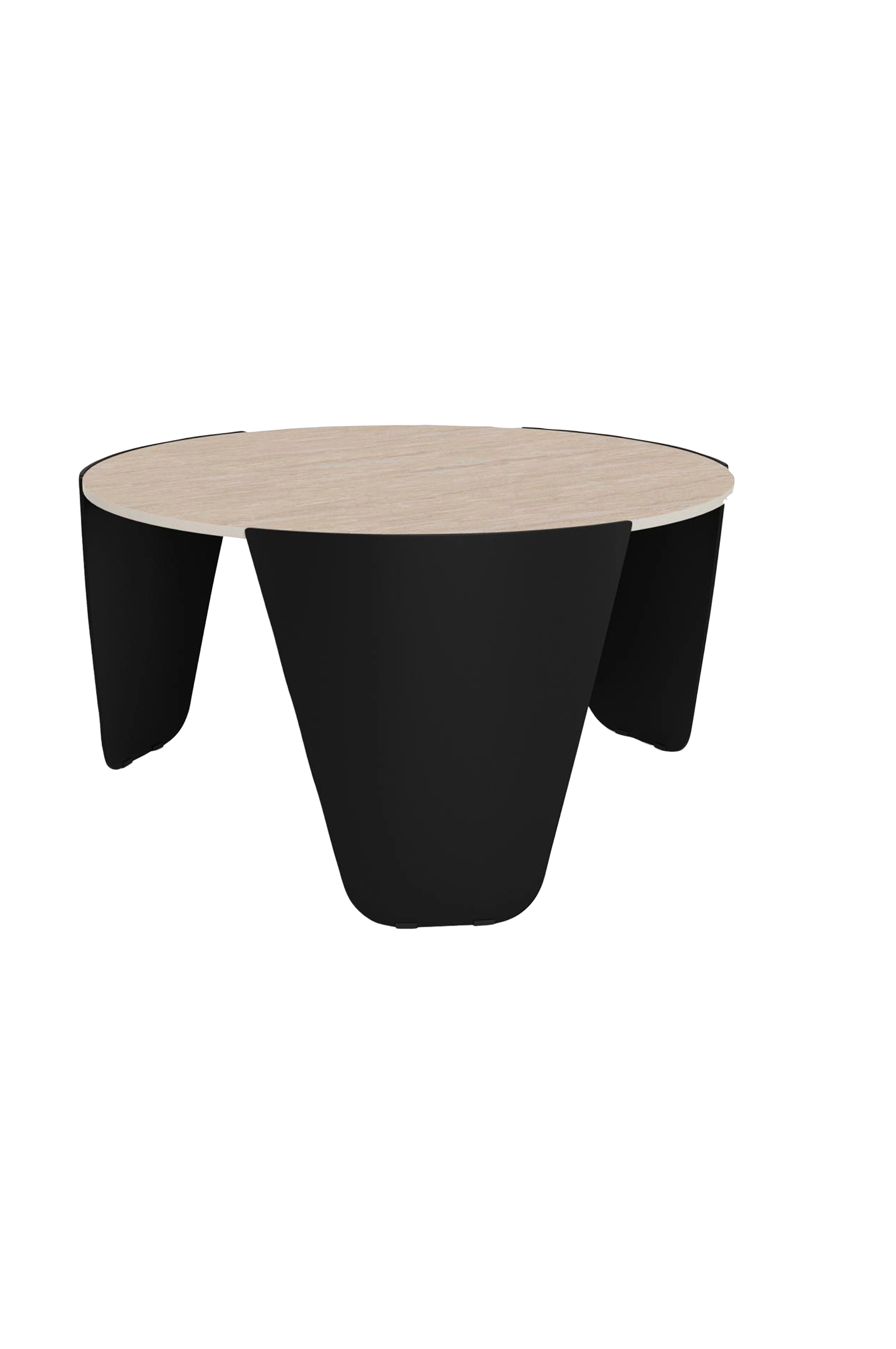 Omfavn det nye utseendet til dette moderne salongbordet. Det kombinerer moderne og praktiske materialer i en elegant, men diskré design. De flate bena, som er laget av, utfyller den runde toppen prydet med et subtilt motiv. Dette er et bord som vil friske opp enhver moderne stue.