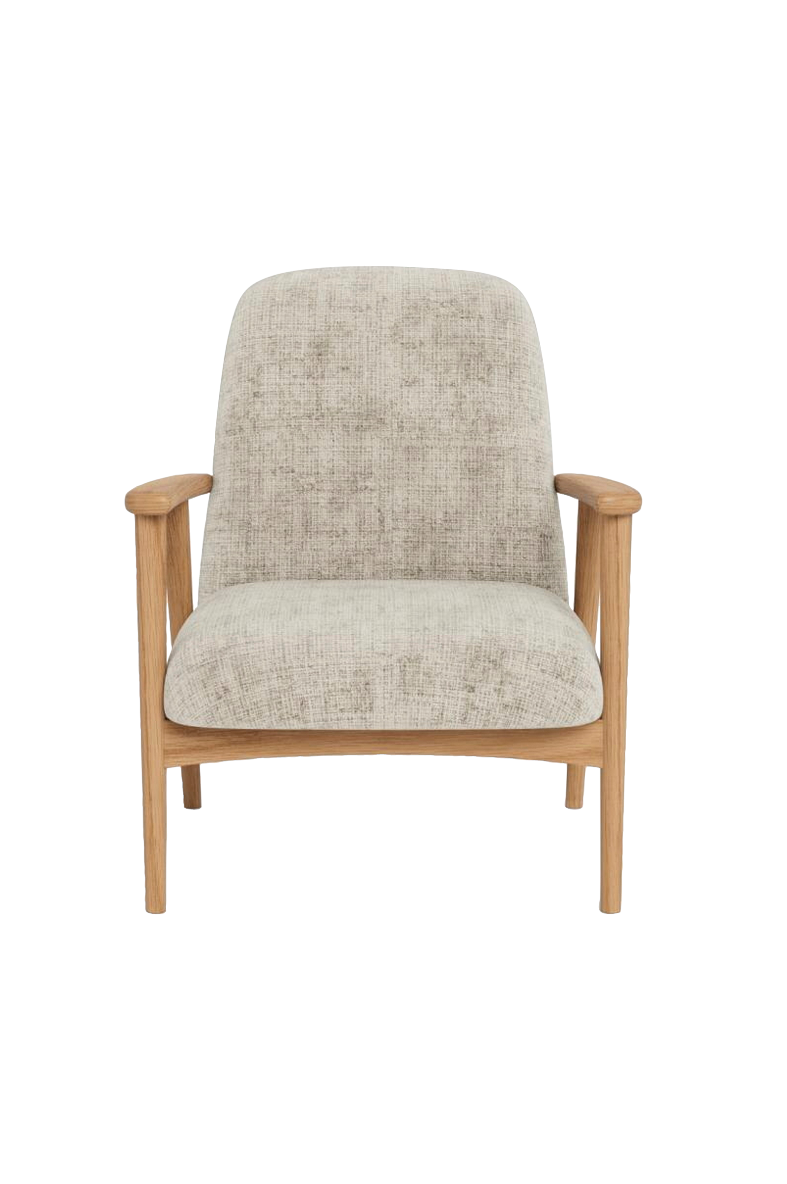 Denne lenestolen har et moderne nordisk uttrykk med en kombinasjon av jordfarger og taktile materialer. Med lakkert, massiv eik og et mykt stoff med en levende, strukturert overflate gir den en følelse av ro i interiøret. Setet er utstyrt med pocketfjærer for økt komfort, mens proporsjonene og de elegante detaljene gir karakter til ethvert oppholdsrom.