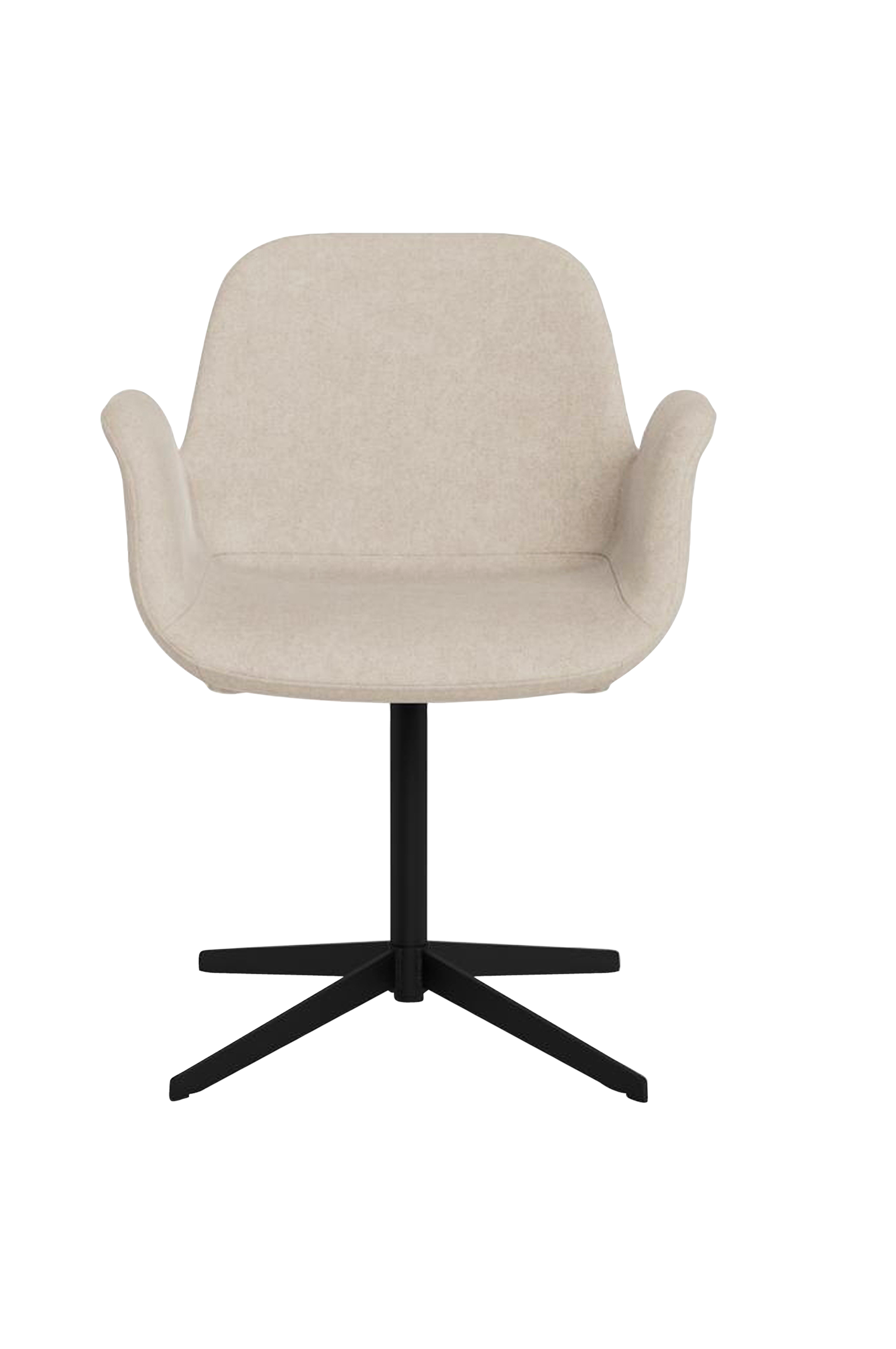 Denne spisestolen med armlener kjennetegnes av sitt buede og moderne uttrykk. Myke snitt og et trekk som omfavner det slanke setet, gjør at den ser innbydende og sympatisk ut. Stolen er designet med et 4-stjerners understell i pulverlakkert materiale og passer enkelt sammen med ethvert spisebord.