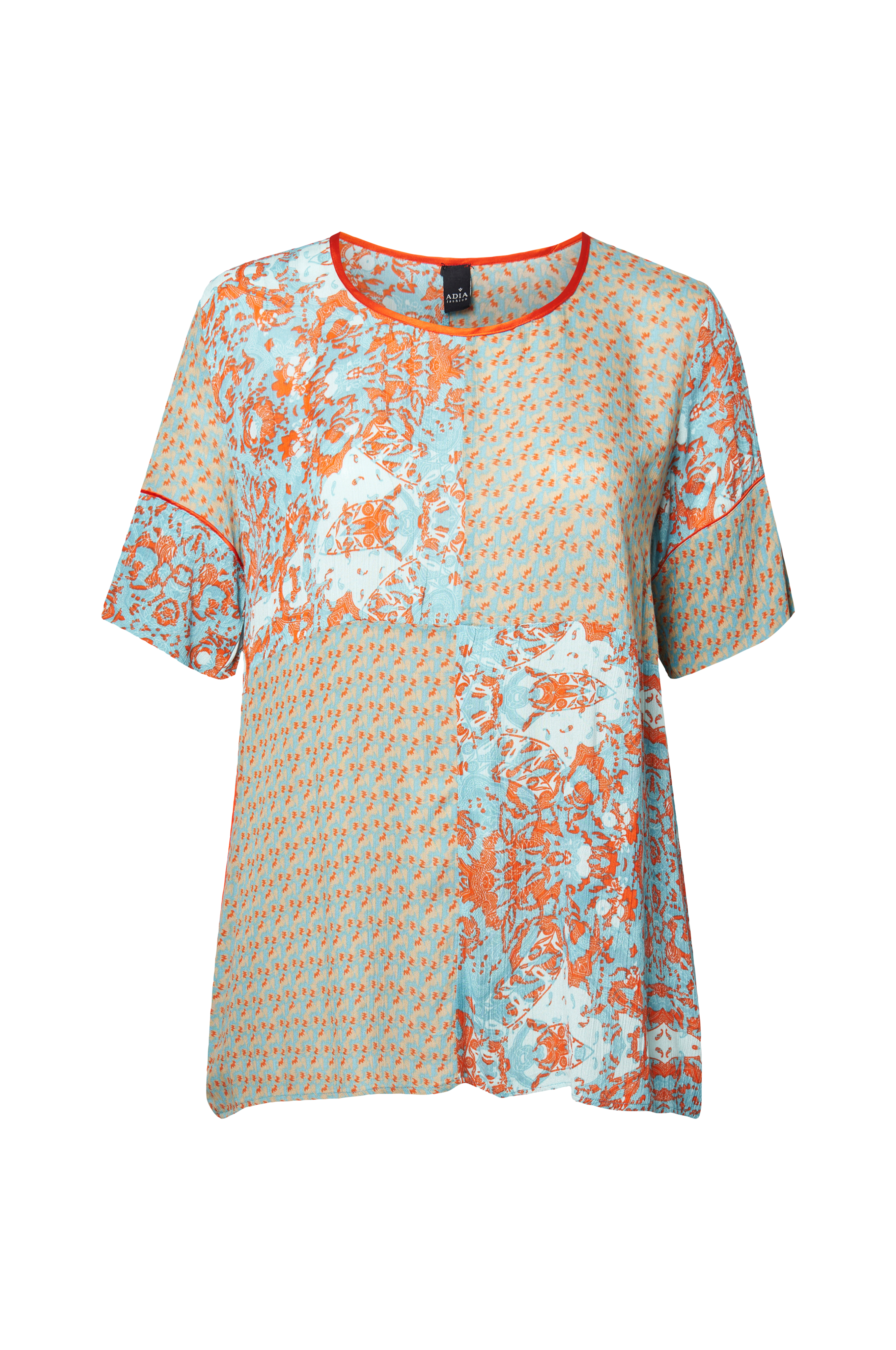 Bluse i viskose med trykt mønster. Rett passform og rund hals. Korte ermer.