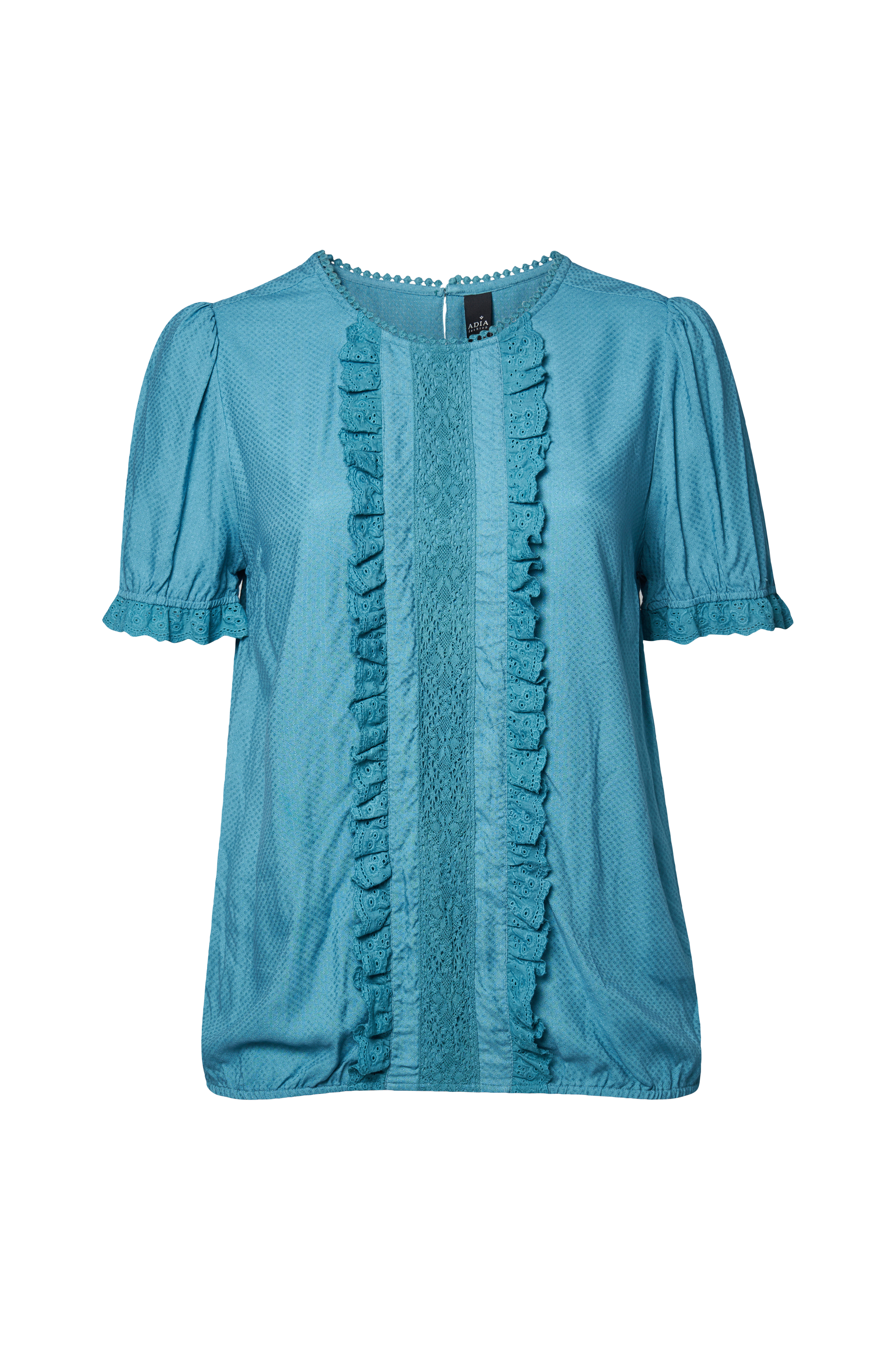 • Korte ermer med volang i ermeslutten• Dekorativ kant i halsen• Ventilasjon med knapp i nakken• Volanger med hullbroderi foran• Panel i heklet blonde foran• Plusstørrelser