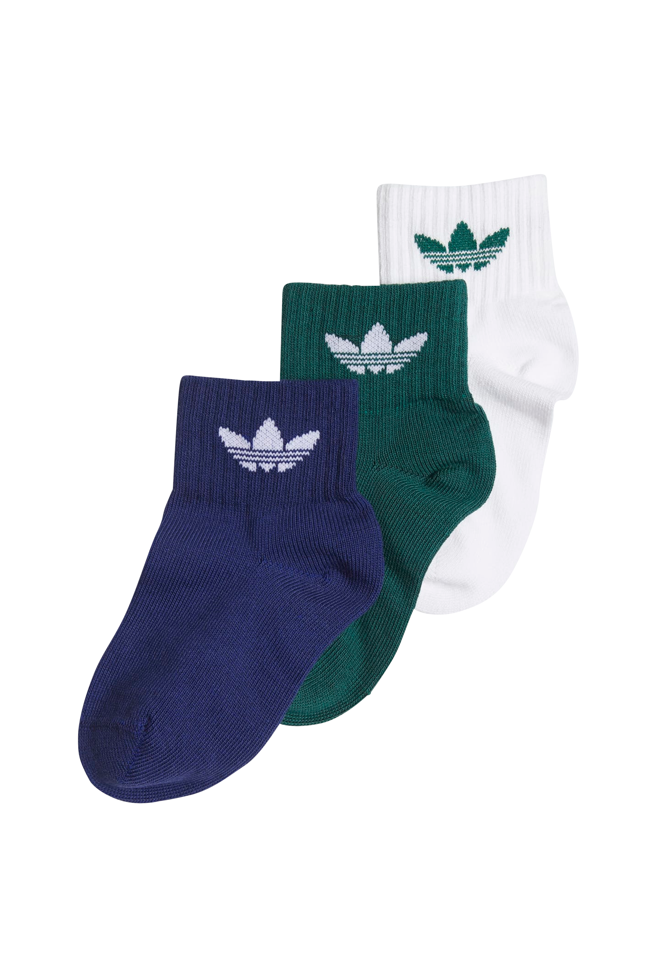 3 par ankelsokker i ulike farger. Vrangbord i skaftet.