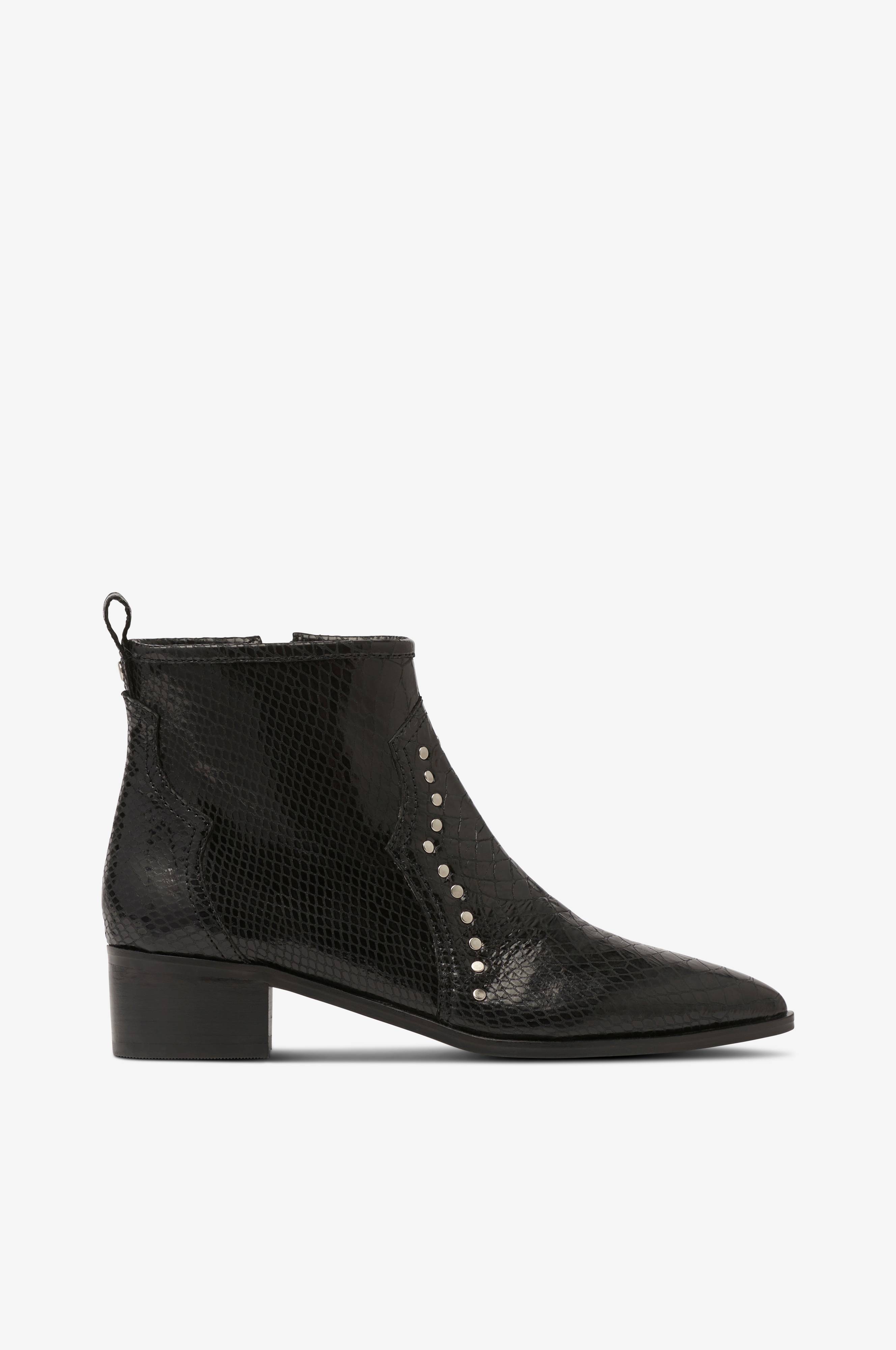 Boots Croco fra Agnes Cecilia er i krokopreget skinn med sølvfargede nagler og spiss tåform. Skaftet har mykt skinnfôr med tekstilfôr i tåen. Myk innersåle i skinn. Hæl i treimitasjon. Skafthøyde ca. 11,7 cm. Hælhøyde ca. 4 cm.