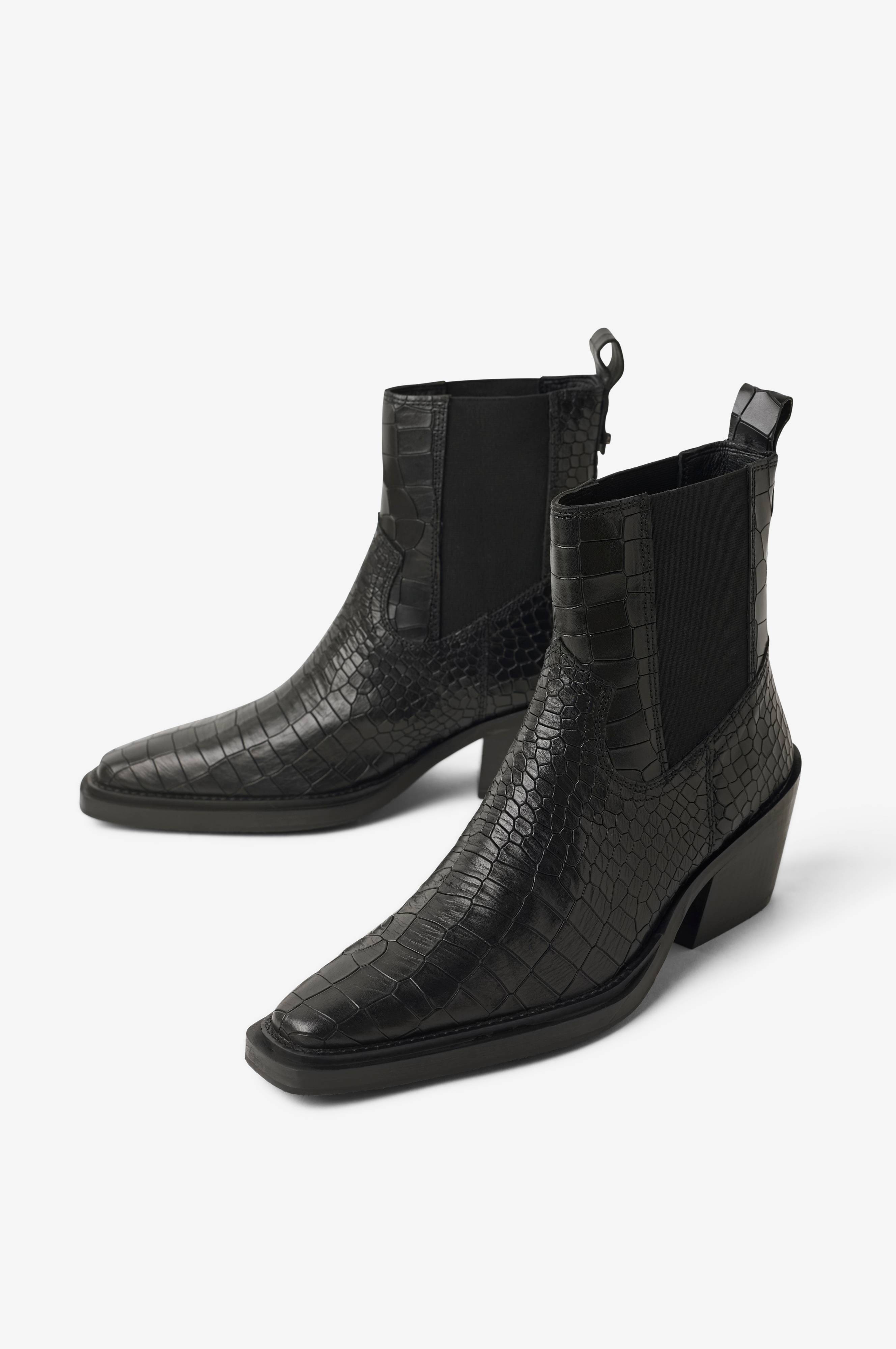 • Modell i cowboy-stil i krokodillepreget lær • Rett tå • Elastiske paneler i sidene • Draflik bakpå • Skafthøyde: 14 cm i størrelse 37 • Hælhøyde: 7 cm