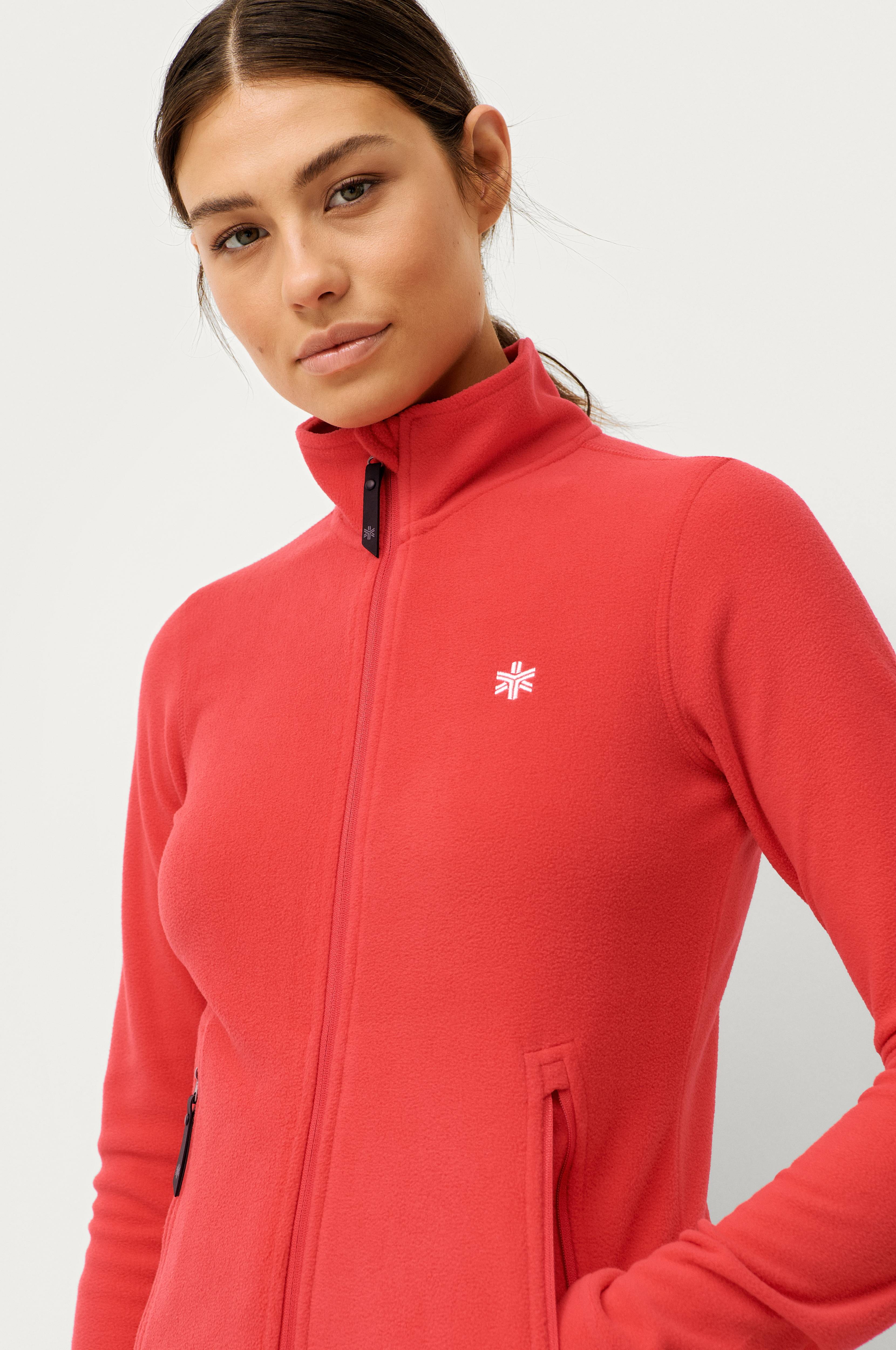 Smidig fleecejakke fra Áhkká i mikrofleece som varmer og leder bort fukt. Myk innside. Høy krage og glidelås med hakebeskyttelse. To lommer med glidelås. Brodert logo på brystet. Lag 2. Lengde bak ca. 65 cm i str 34/36.