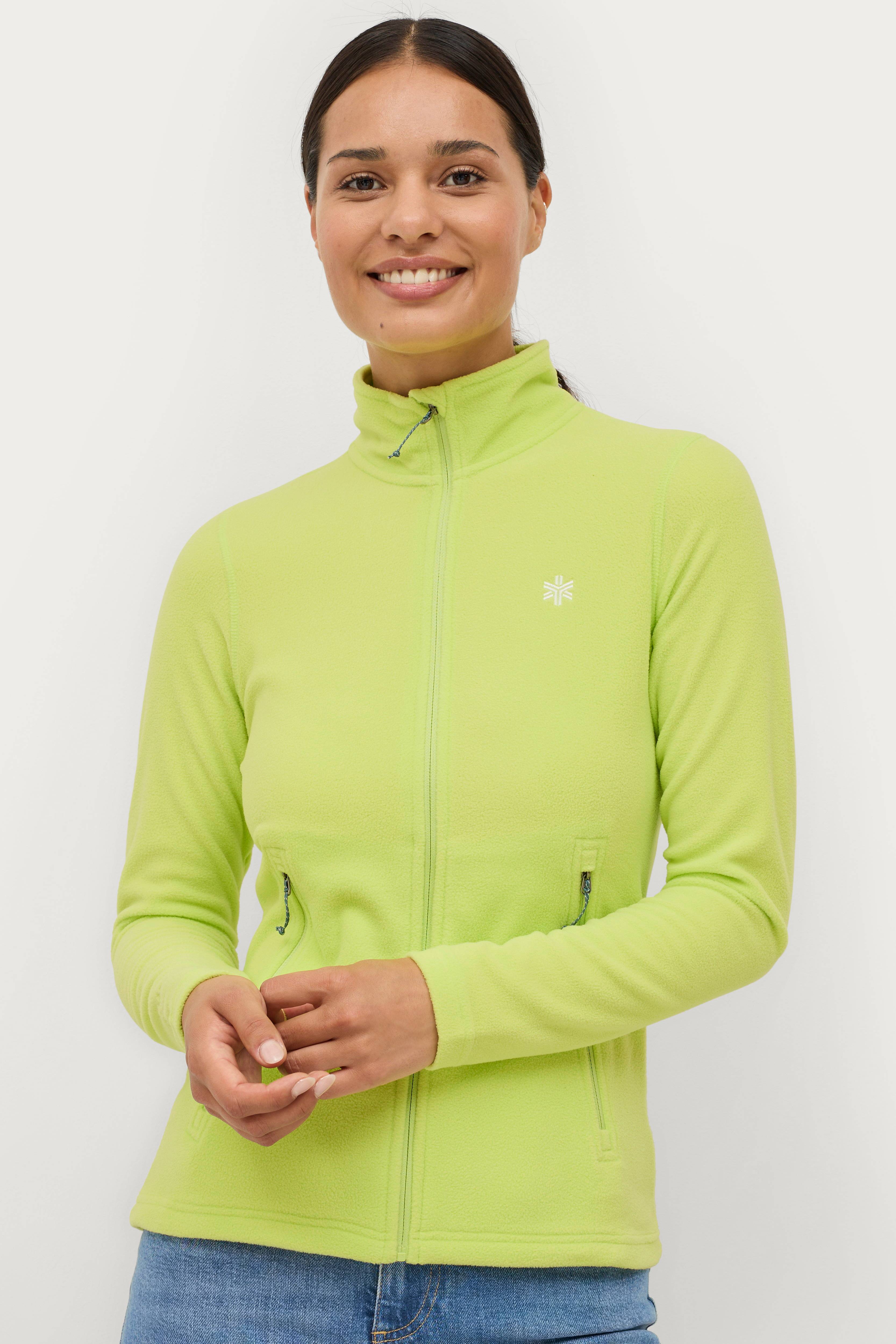 Smidig fleecejakke fra Áhkká i mikrofleece som varmer og leder bort fukt. Myk innside. Høy krage og glidelås med hakebeskyttelse. To lommer med glidelås. Brodert logo på brystet. Lag 2. Lengde bak ca. 65 cm i str 34/36.