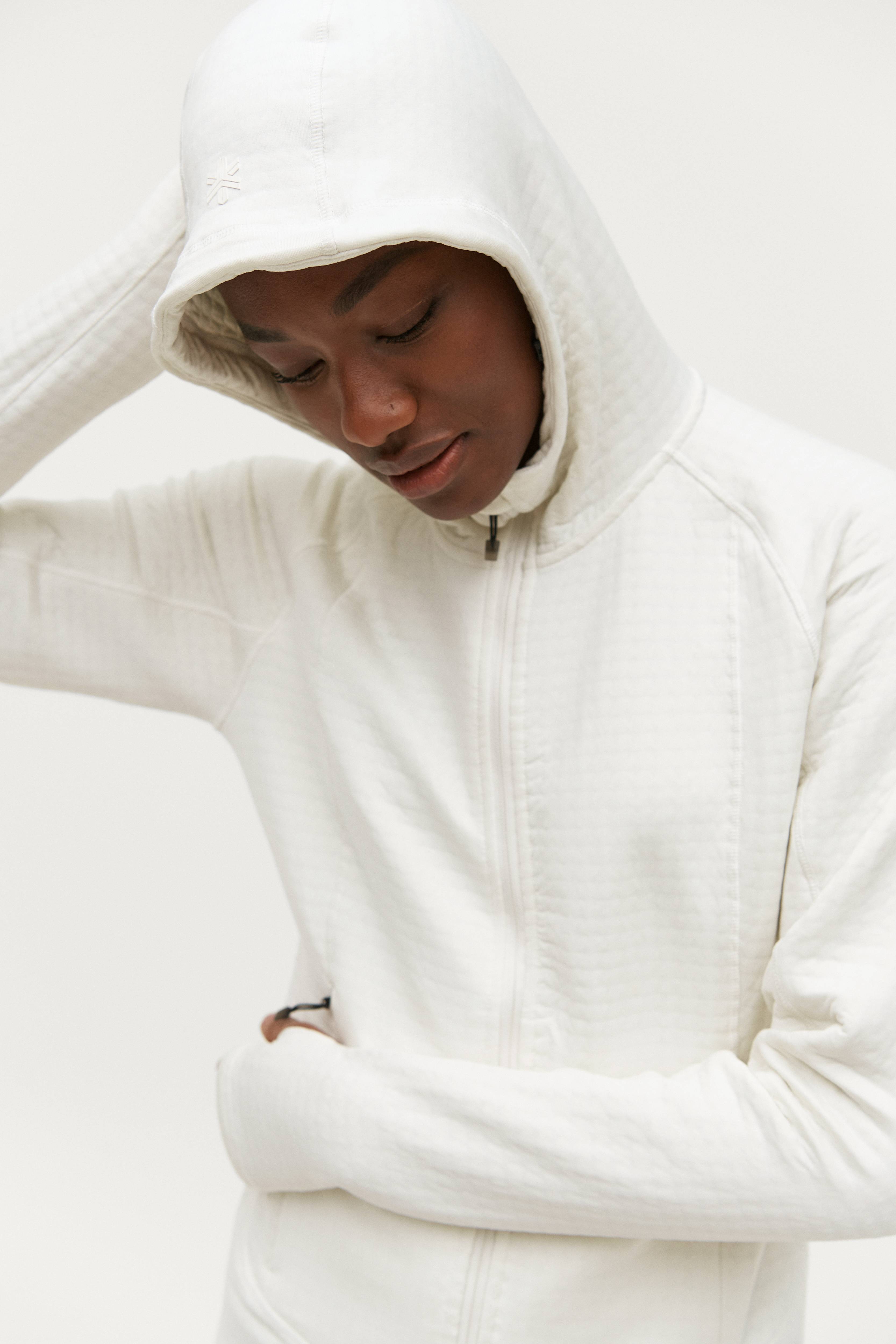 Figurnær hettejakke fra Áhkká by Renata. Jakken fungerer som et varmende mellomlag og er produsert av Polartec® Power Air™-stoff med en ny revolusjonerende strikketeknikk: Stoffet er strikket med små lommer fylt med fibre, der varm luft kapsles inn og minsker mikrofiberutslipp. Sluttresultatet er et høyfunksjonelt, solid stoff med avansert varmende evne. Stoffet er mykt, elastisk og slipper fra seg minst 5 ganger mindre mikrofiber enn moderne syntetfleece-tekstiler.