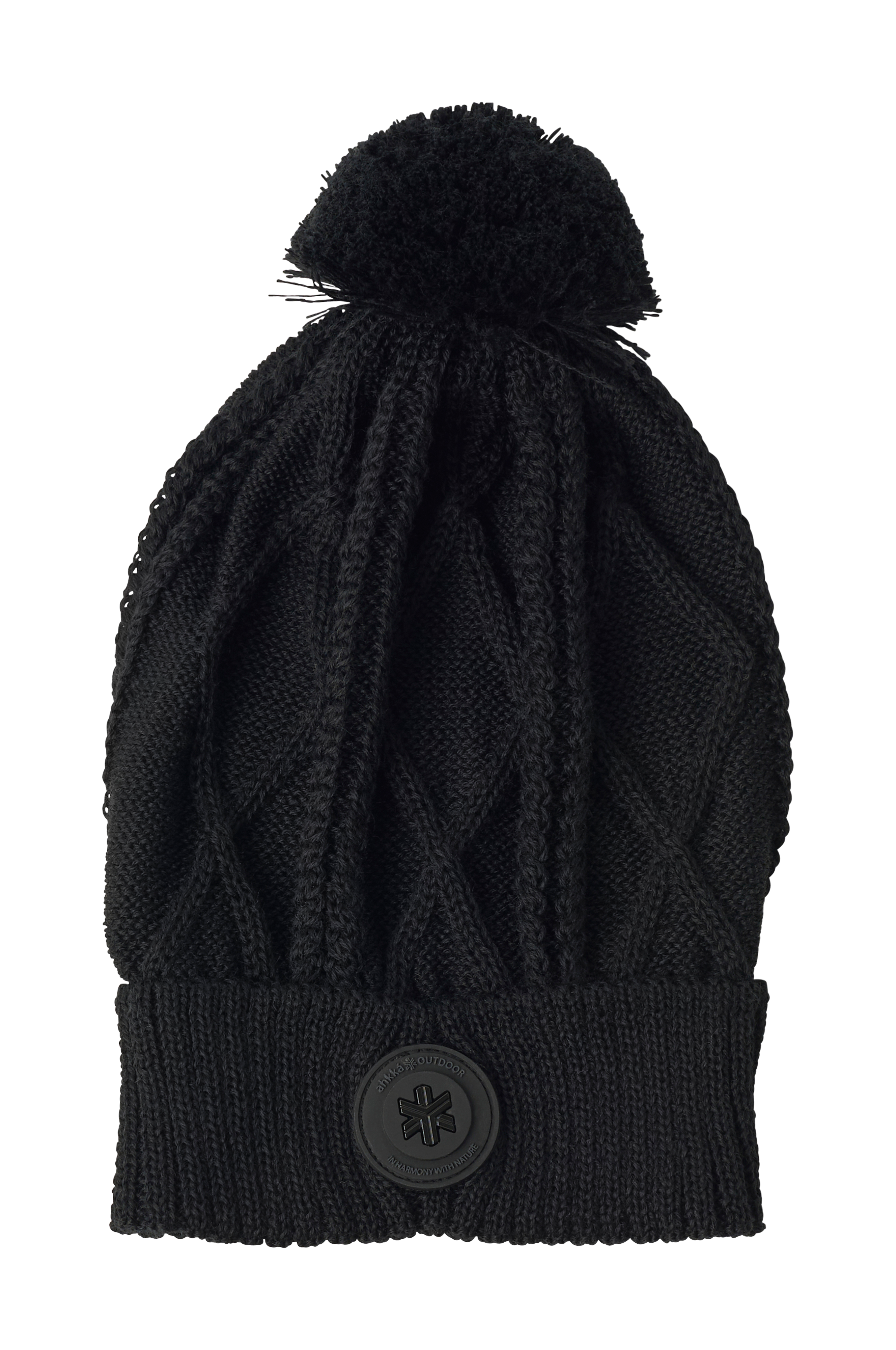 Flettestrikket lue fra Áhkká med myk og fluffy dusk. Ribbestrikket, oppbrettet nederkant med gummiert logo.