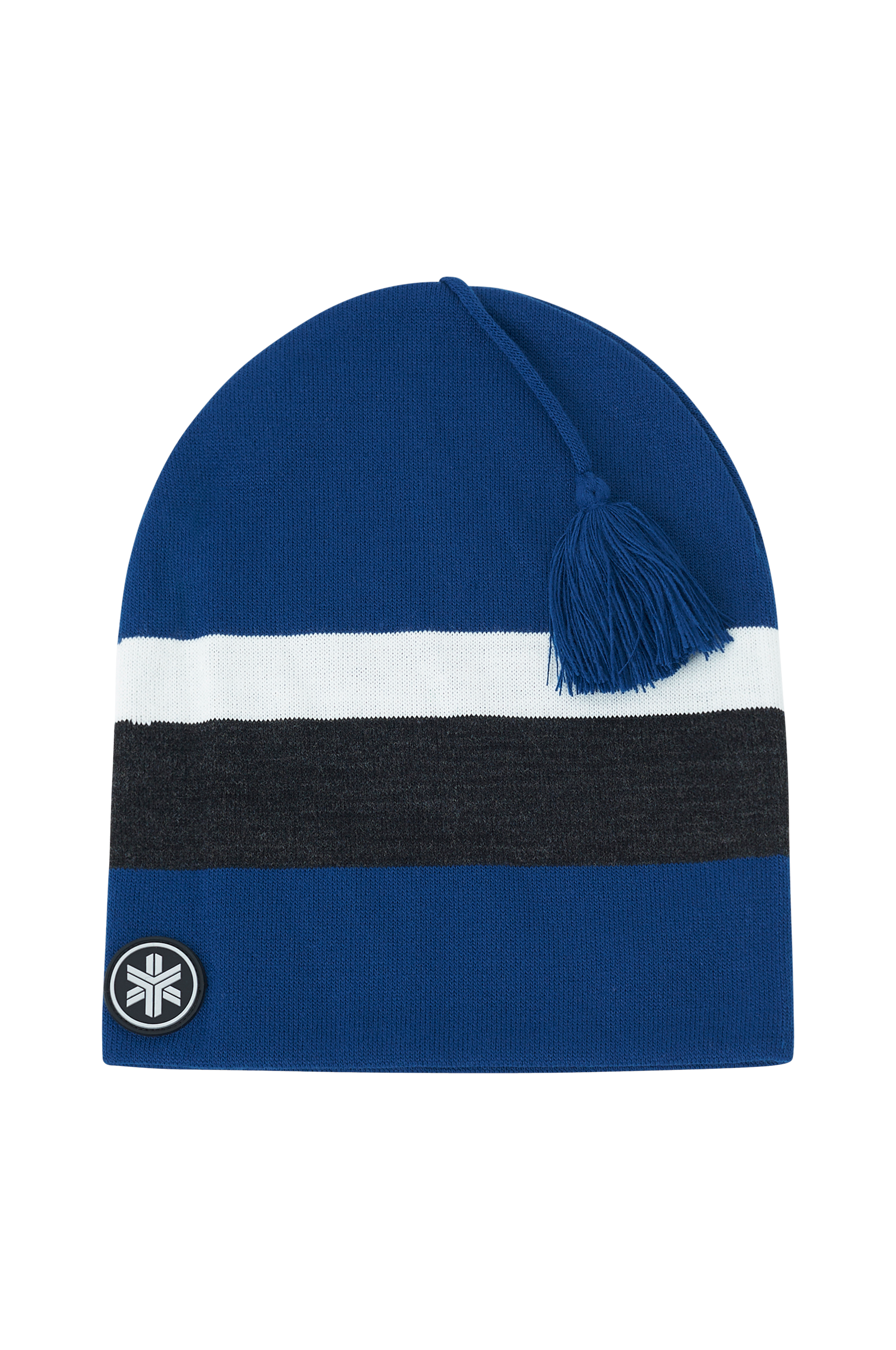 Dobbeltstrikket lue Beanie With Stripes fra Áhkká med dusk og striper i ulike farger. Gummiert merke i nederkanten. Produsert i Sverige.