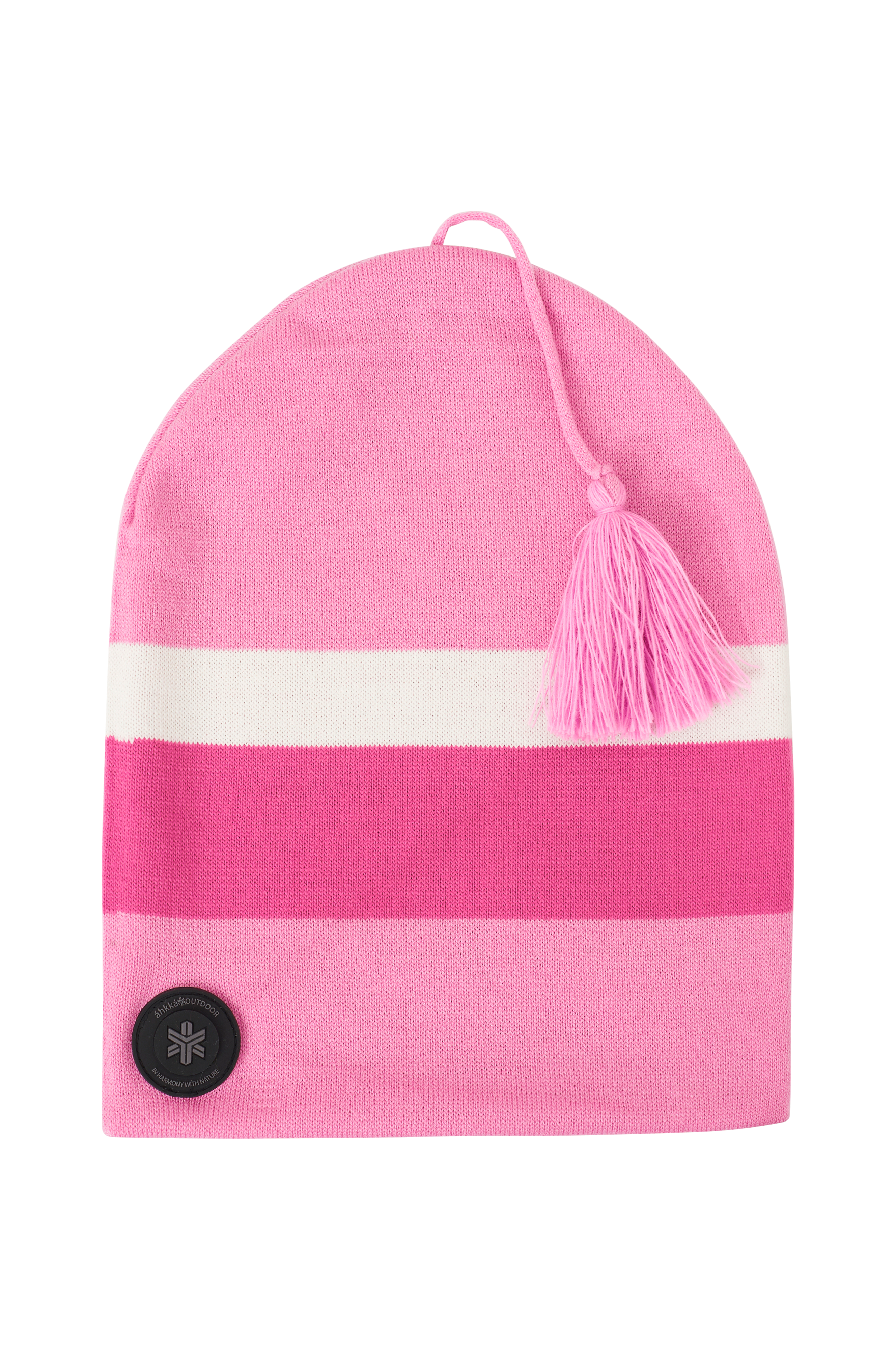 Dobbeltstrikket lue Beanie With Stripes fra Áhkká med dusk og striper i ulike farger. Gummiert merke i nederkanten. Produsert i Sverige.