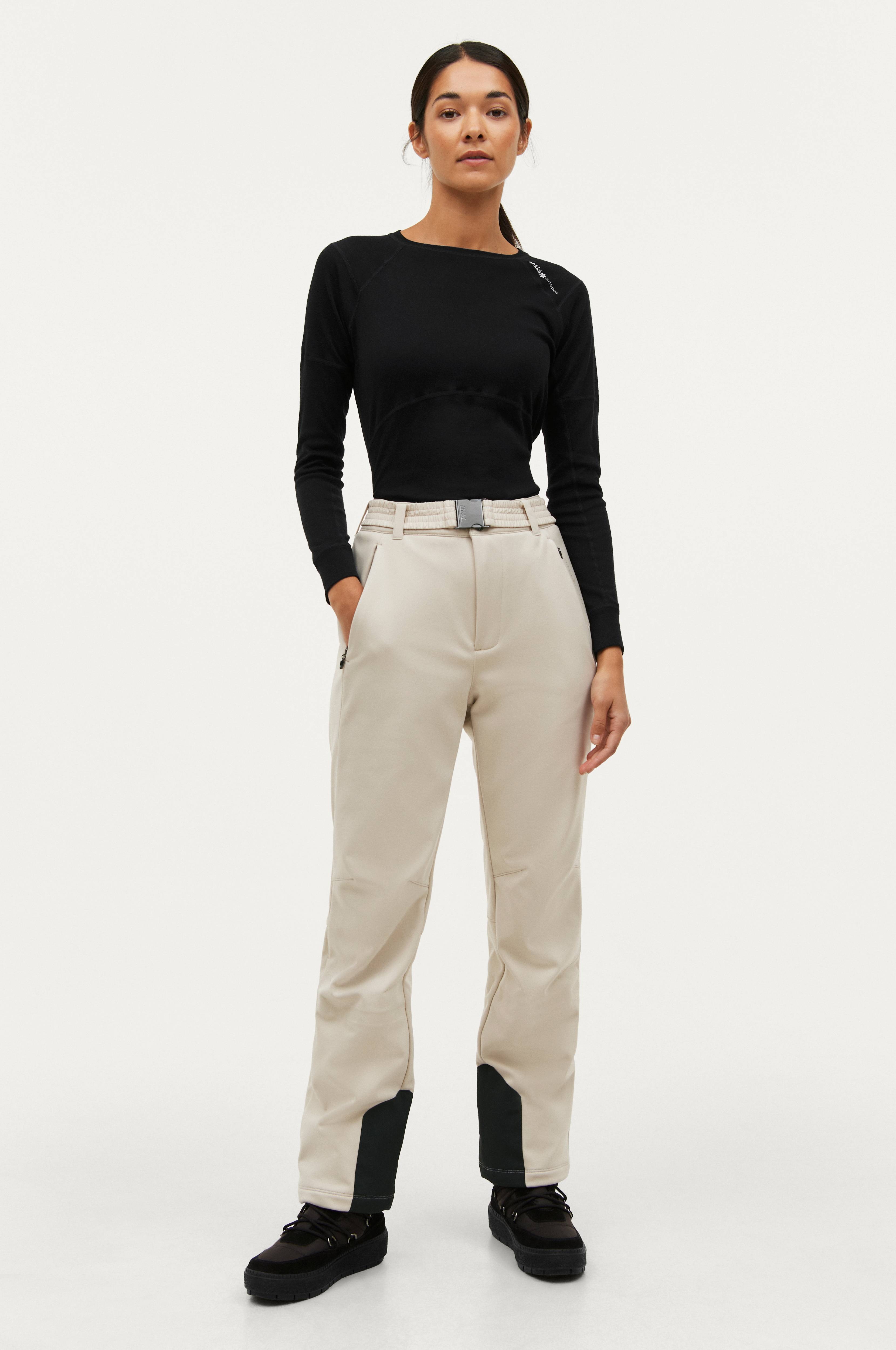 Skibukse i elastisk softshell med smal silhuett. Myk fleece på innsiden. Vindavvisende og vanntett stoff 3 K/3 K.