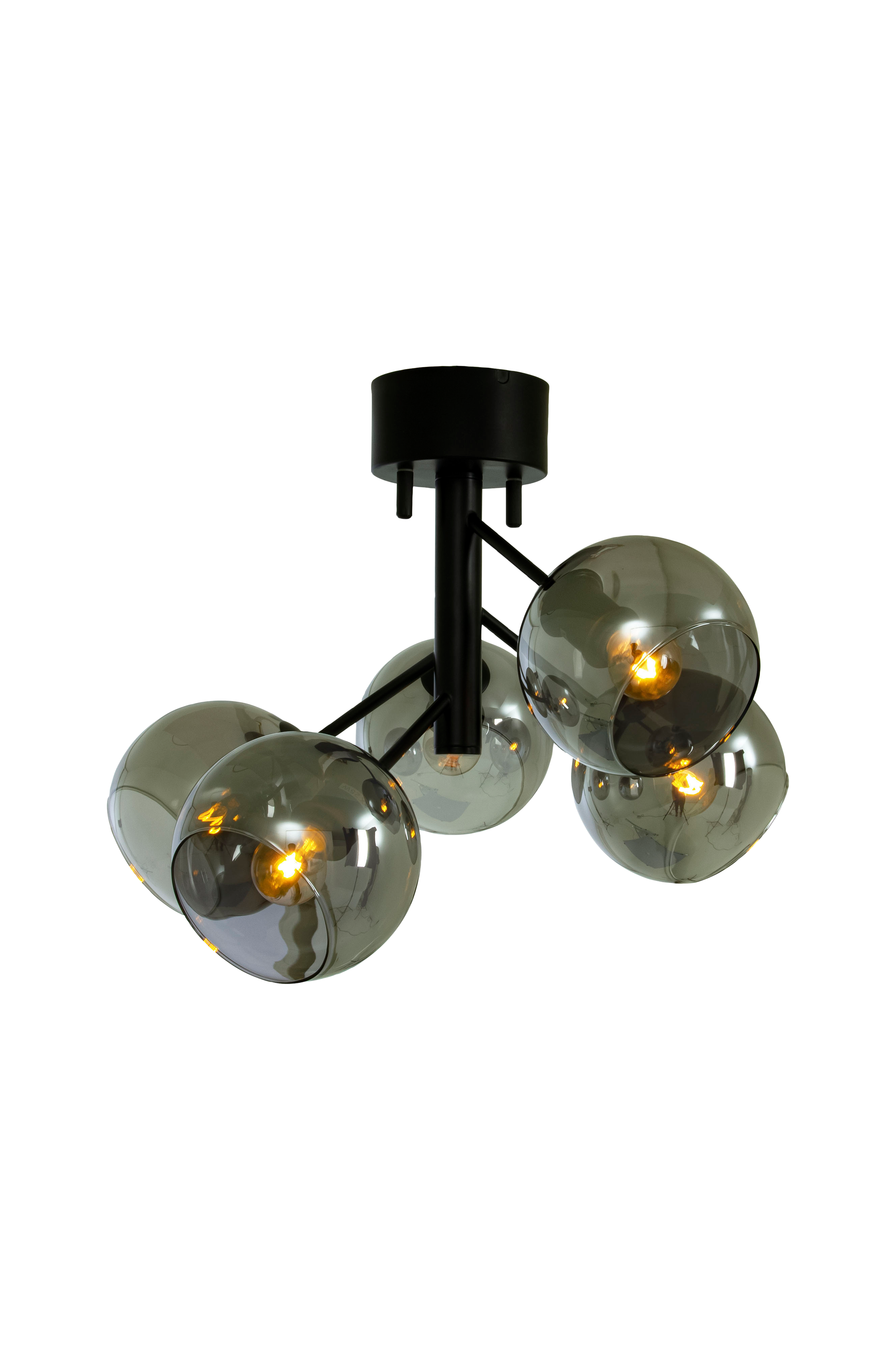 Den moderne plafonden Atom har fem vakkert røykfargede glasskupler plassert i ulike høyder for en herlig asymmetrisk stil. Atom plafond blir et spennende innslag i gangen, stua, soverommet eller uansett hvor du plasserer den. Atom plafond kan også kombineres med andre lamper i Atom-familien.