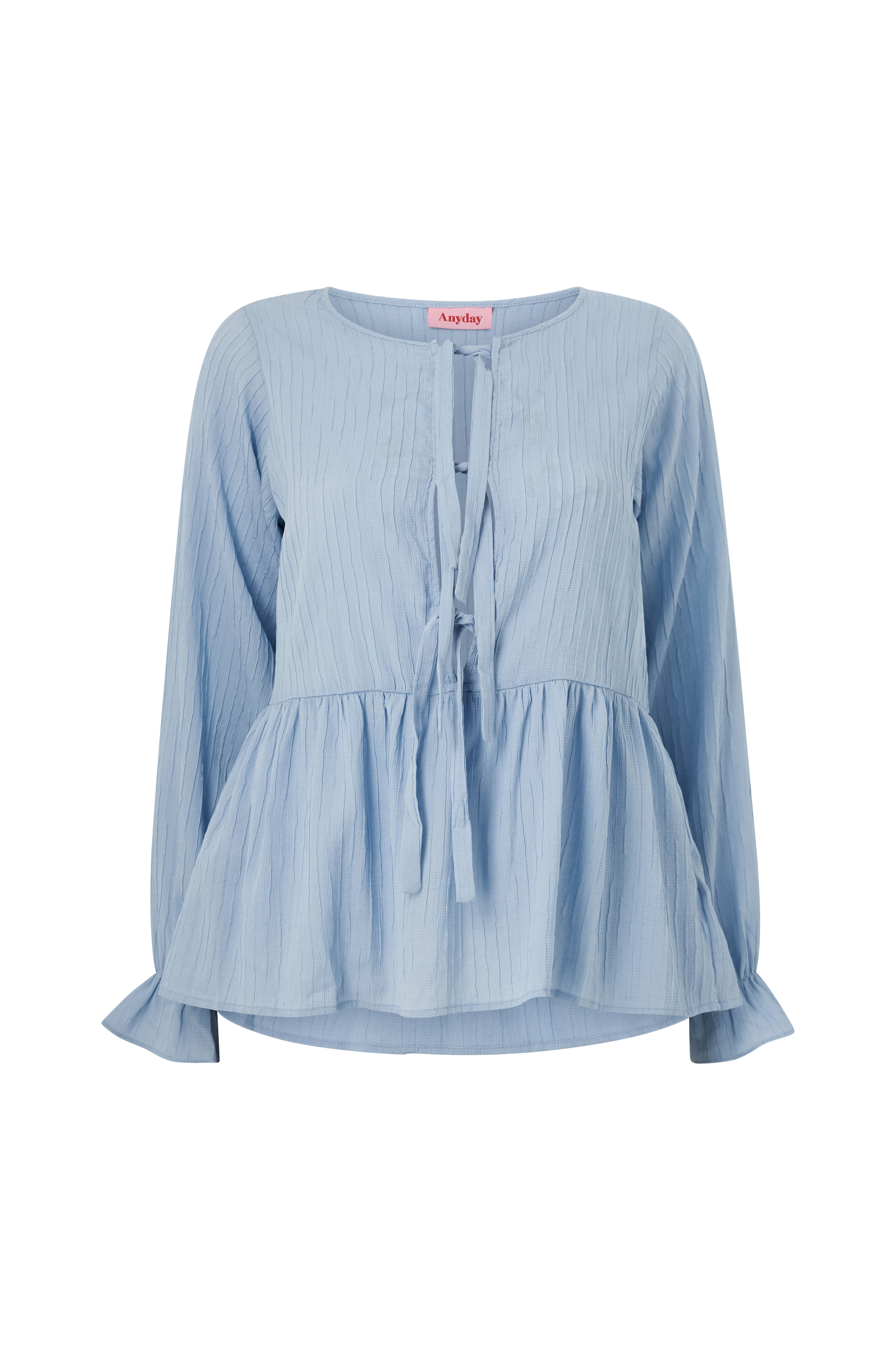 • Bluse i polyester med strukturmønster• Lange ermer med gummistrikk og volangkant ved armenden• Avrundet hals• Åpning foran med knytebånd• Volangdesign på bunnen• Plusstørrelser