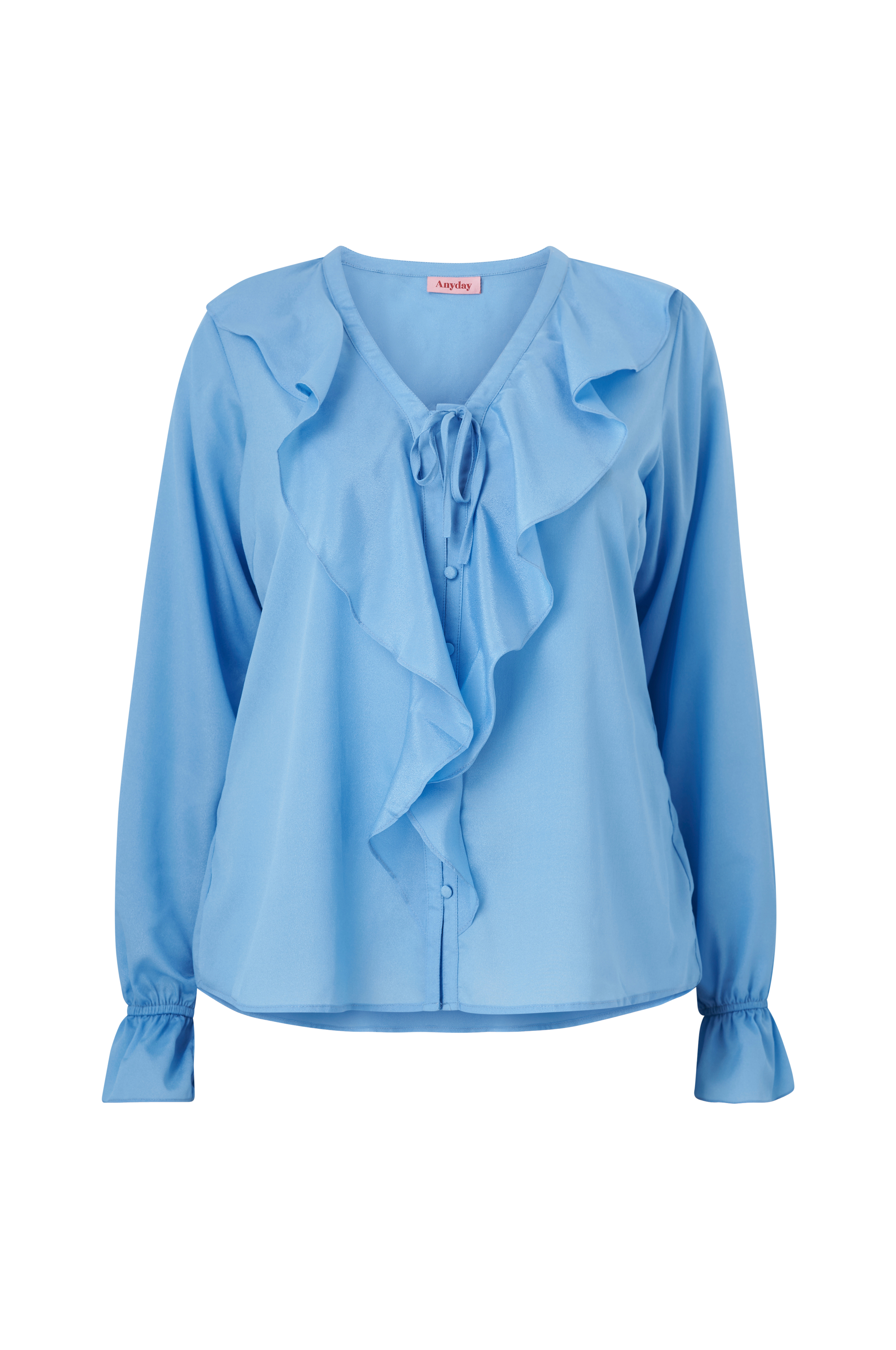 • Luftig bluse i bomull med lett skinnende tekstur • Lange ermer med gummistrikk og volangkant ved armenden • Knappstolpe foran med kledde knapper og volangdesign • V-formet hals med volangkant og dekorativ knytbar tråd foran • Innsnitt ved bysten • Plusstørrelser
