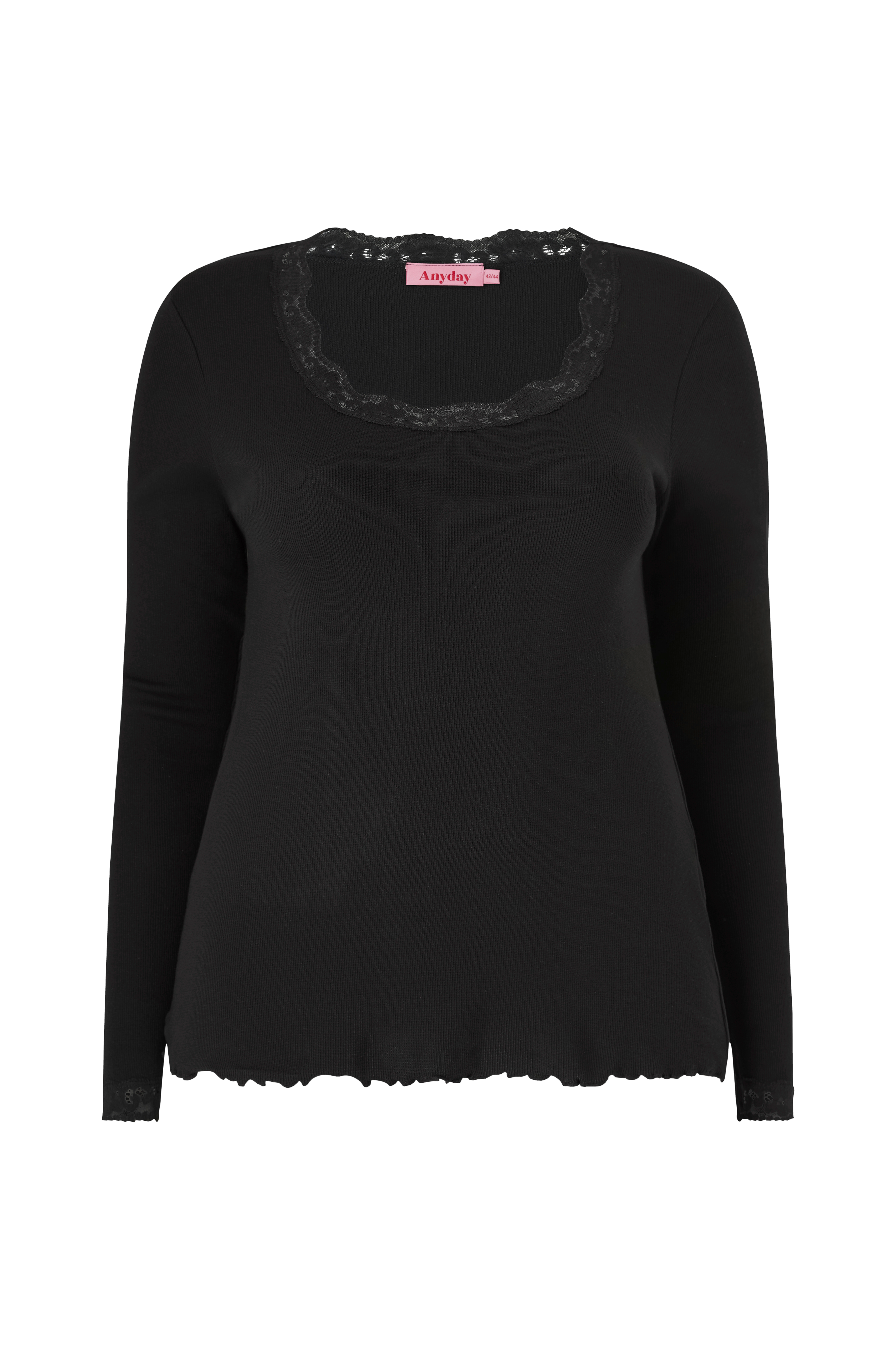 • Ribbet topp i bomull og viskose• Rund hals med blondekant• Lange ermer med blondekant ved armenden• Bølget hem• Pluss-størrelser