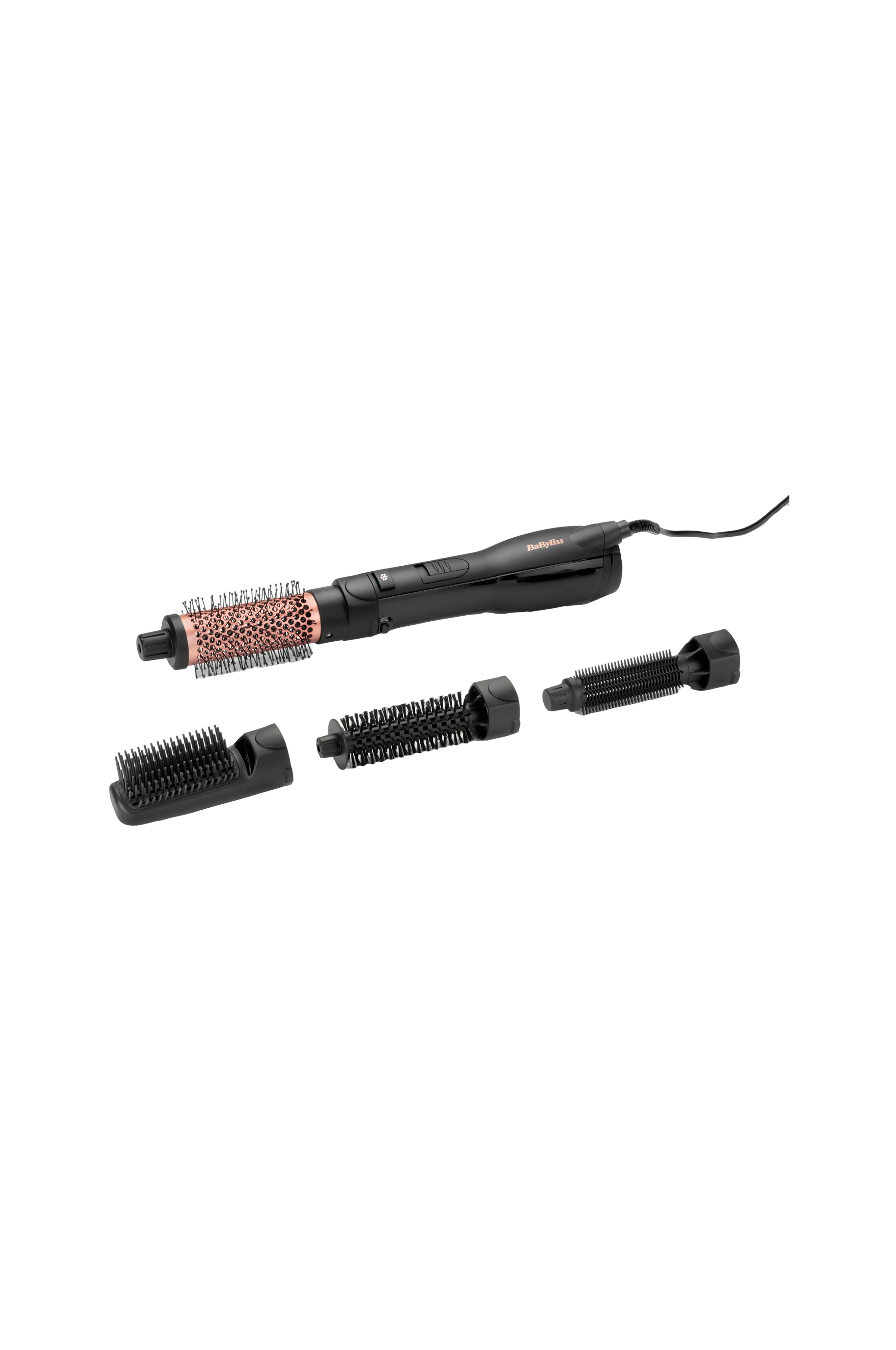 BaByliss Smooth Finish 1200 W varmluftbørste tørker og styler på en og samme gang. Med fire utskiftbare hoder som tørker, gir volum, glatter ut og retter håret. Skap vakkert volum når du tørker med en 38 mm varmebørste eller bruk 25 mm eller 20 mm myke børster for å forme håret. Benytt rettebørsten for et elegant, glatt og glinsende resultat. Lav vekt gir enkel håndtering og salonglignende føneresultat hjemme.