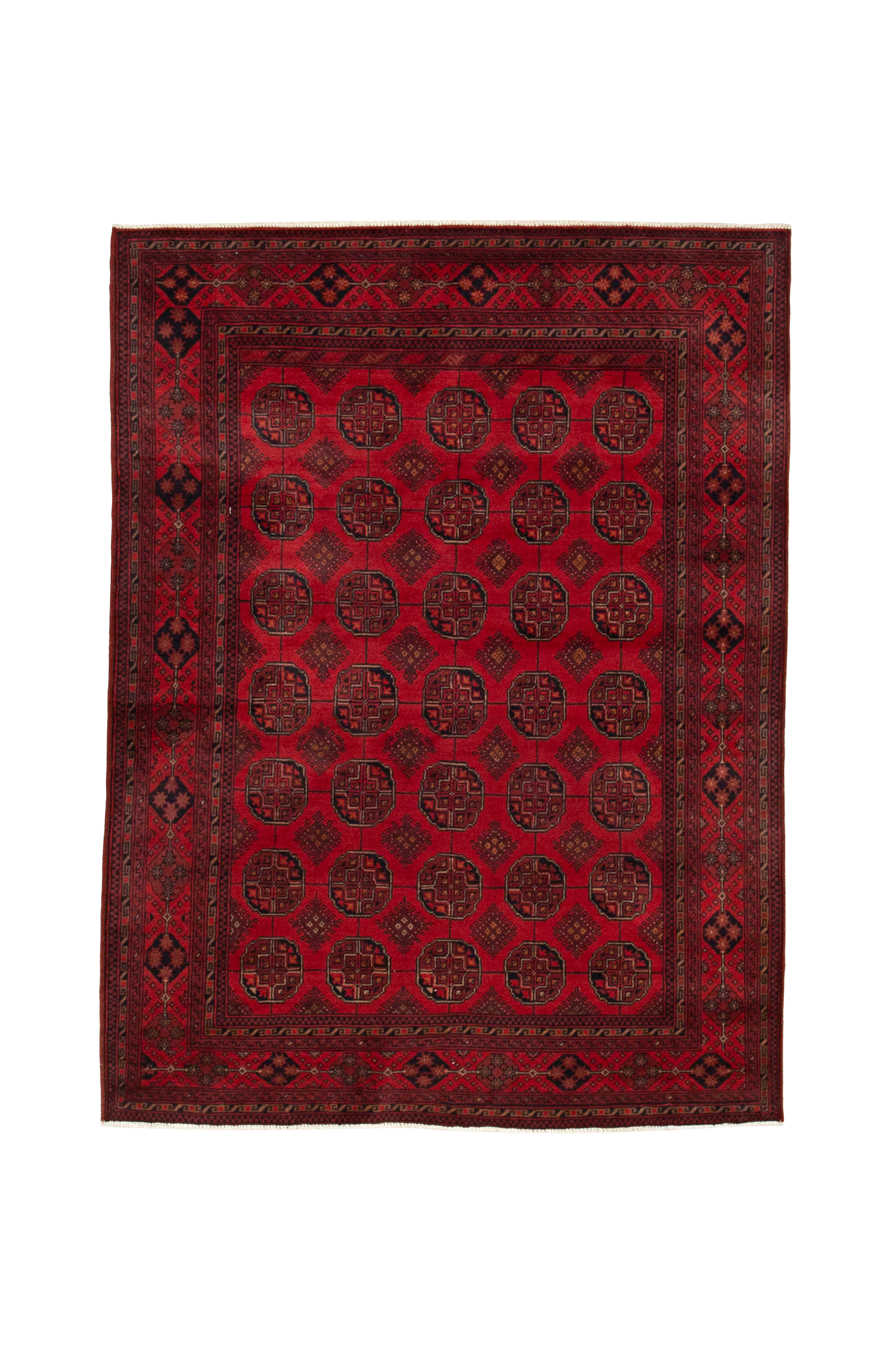Khal Mohammadi er et melert teppe i ull av høy kvalitet med et sirlig, intrikat og heldekkende geometrisk mønster i svart. En bred bord knytes sømløst sammen med midtpartiets mønstrede kvadrater. Håndknyttet.