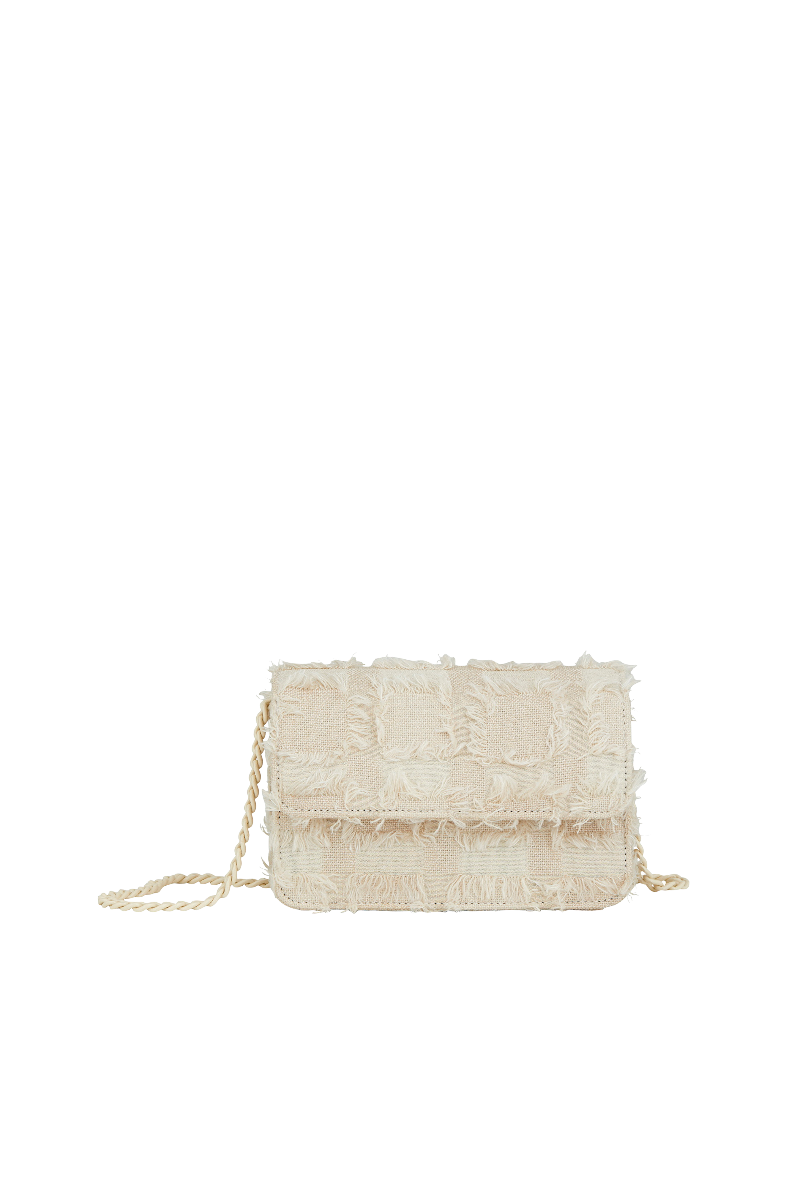 • Liten vesken i tekstil med frynset mønster• Veskekjede• Tekstilfôr• Beholderen med glidelås på innsiden• Skjult trykknapp• Mål: B 17,5 x H 12 x D 5,5 cm