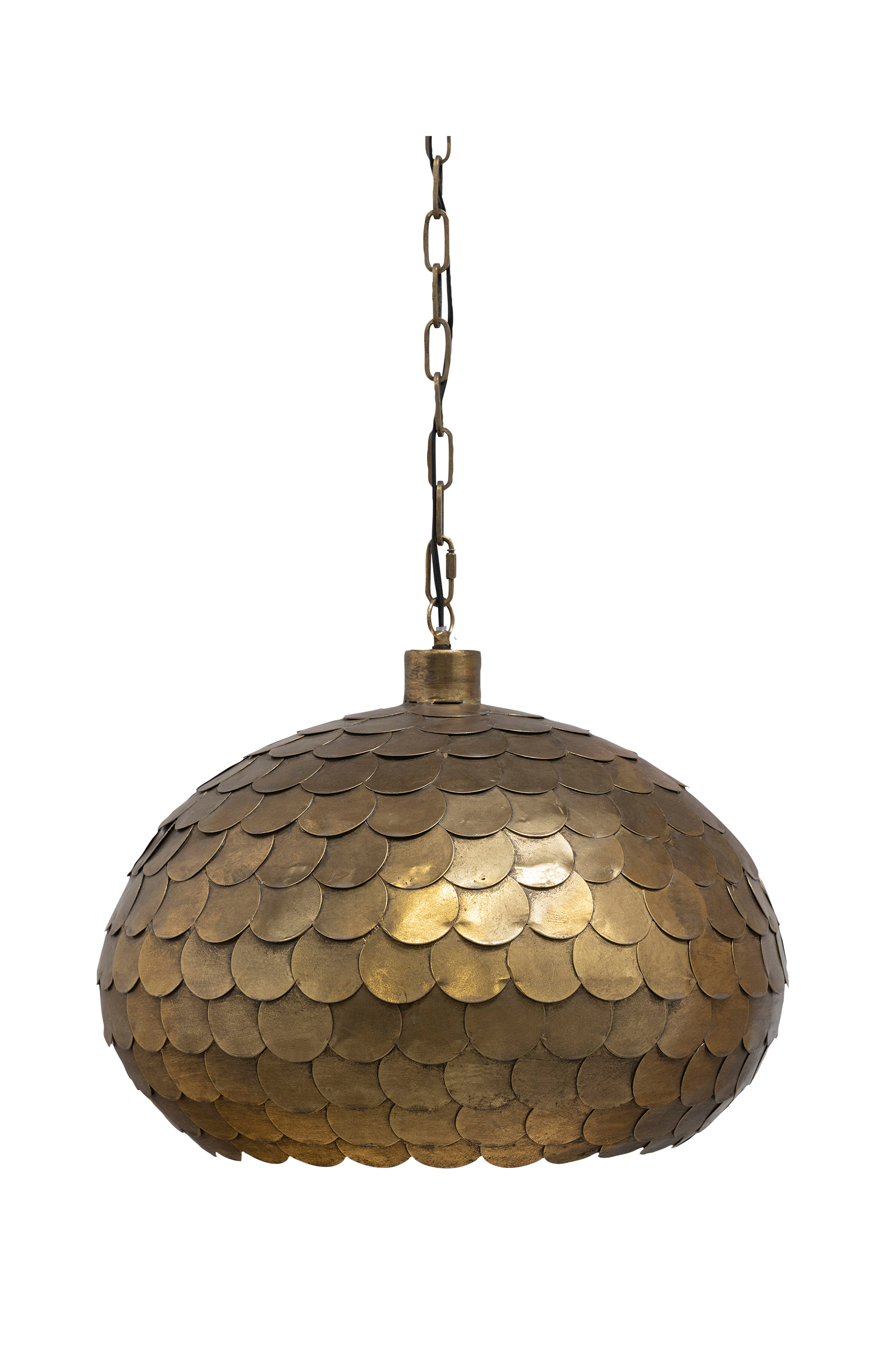 Eksentrisk klasse, slik beskrives taklampen Shill fra det nederlandske merket BePureHome. Denne hengende taklampen av metall i stor størrelse gir stort inntrykk på grunn av den elegante antikke messingfargen og den skjellignende effekten på lampeskjermen. Kjedelenken rundt ledningen gir Shill ekstra karakter.