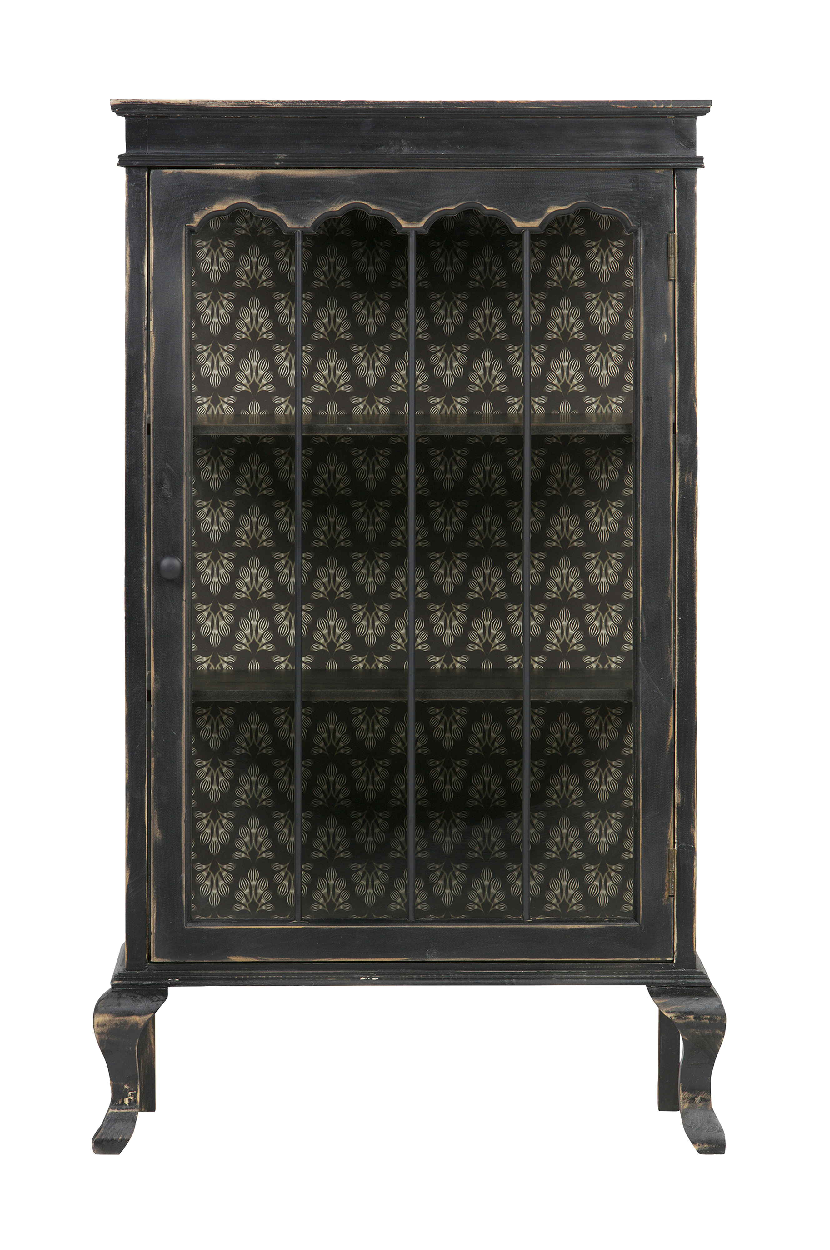 Dette skapet har mange vakre detaljer: dreide ben, et vakkert trykk innvendig i skapet og en klassisk dør.