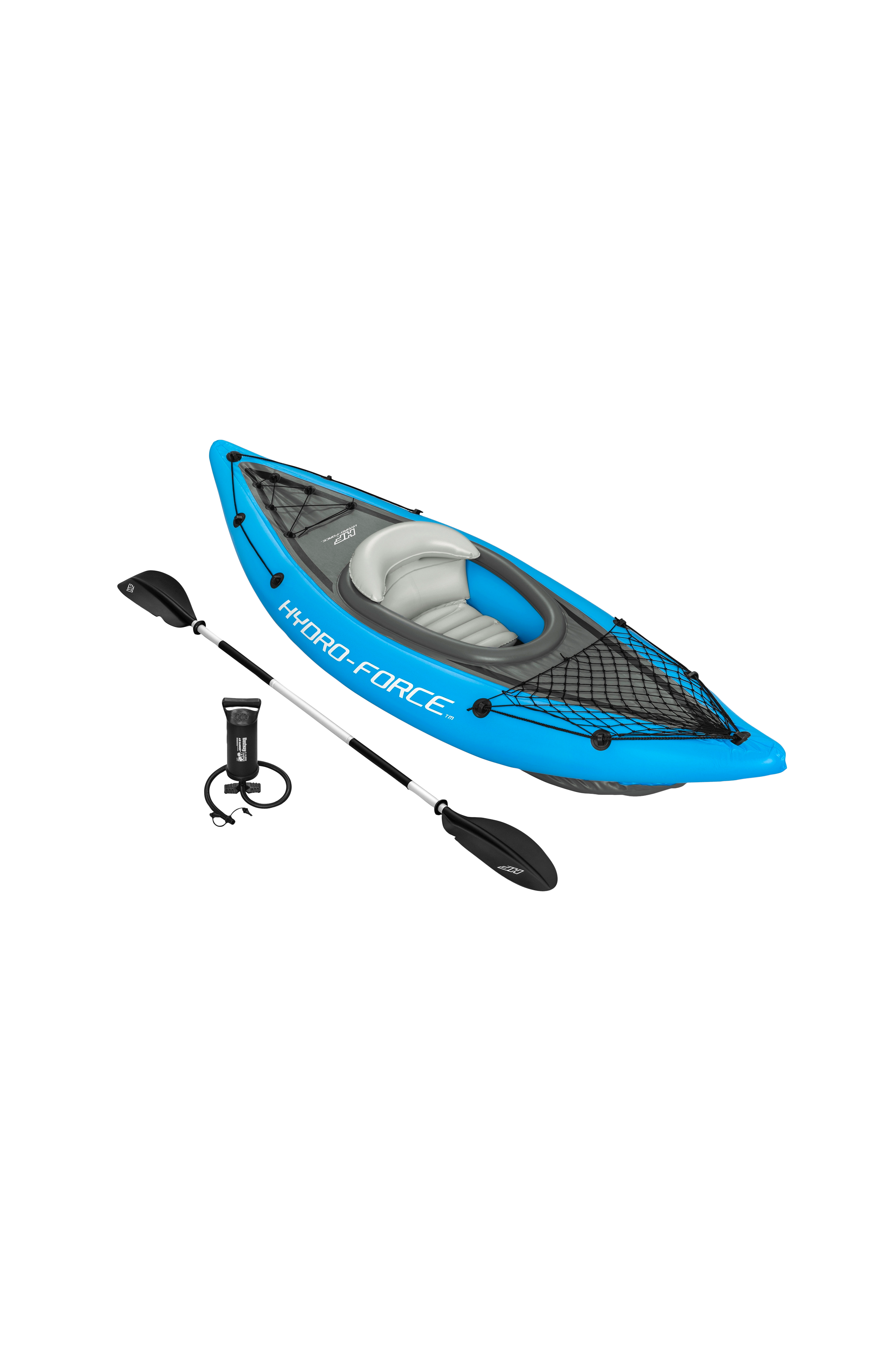 Den komfortable cockpiten har et justerbart, oppblåsbart sete med ryggstøtte for ekstra støtte. Denne kajakken har også rikelig med oppbevaringsplass for snacks, ekstrautstyr eller andre nødvendigheter takket være den medfølgende oppbevaringskabelen og -nettet. I tillegg er det enkelt å navigere i vannet ved hjelp av de to utskiftbare finnene på undersiden, som kan tas av for enkel og kompakt oppbevaring. Avhengig av vannforholdene kan du justere finnestørrelsen etter dine behov.