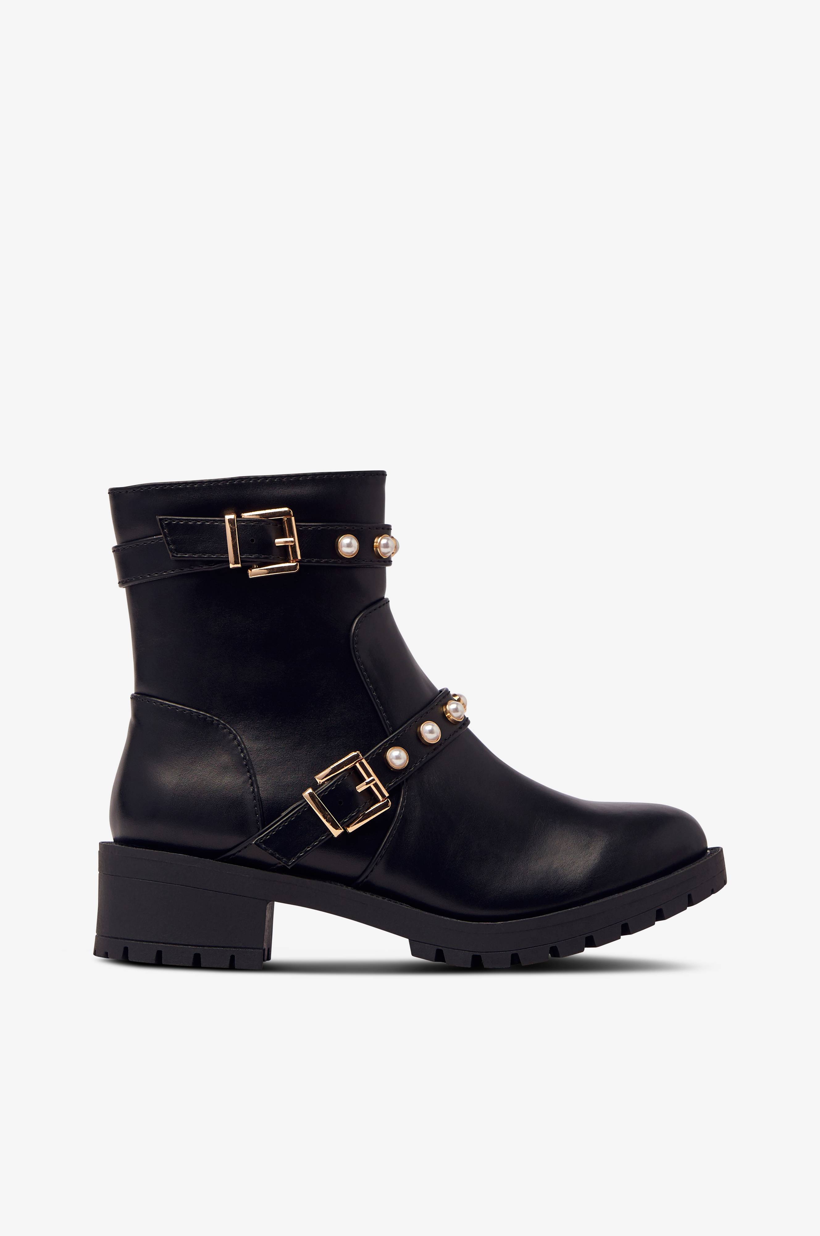 Boots biaPearl Fashion Boot fra Bianco i skinnimitasjon. Bikermodell med to justerbare remmer og dekorative perler. Glidelås på innsiden av skaftet. Litt grovere såle. Skafthøyde ca. 14 cm, hælhøyde ca. 4,5 cm.