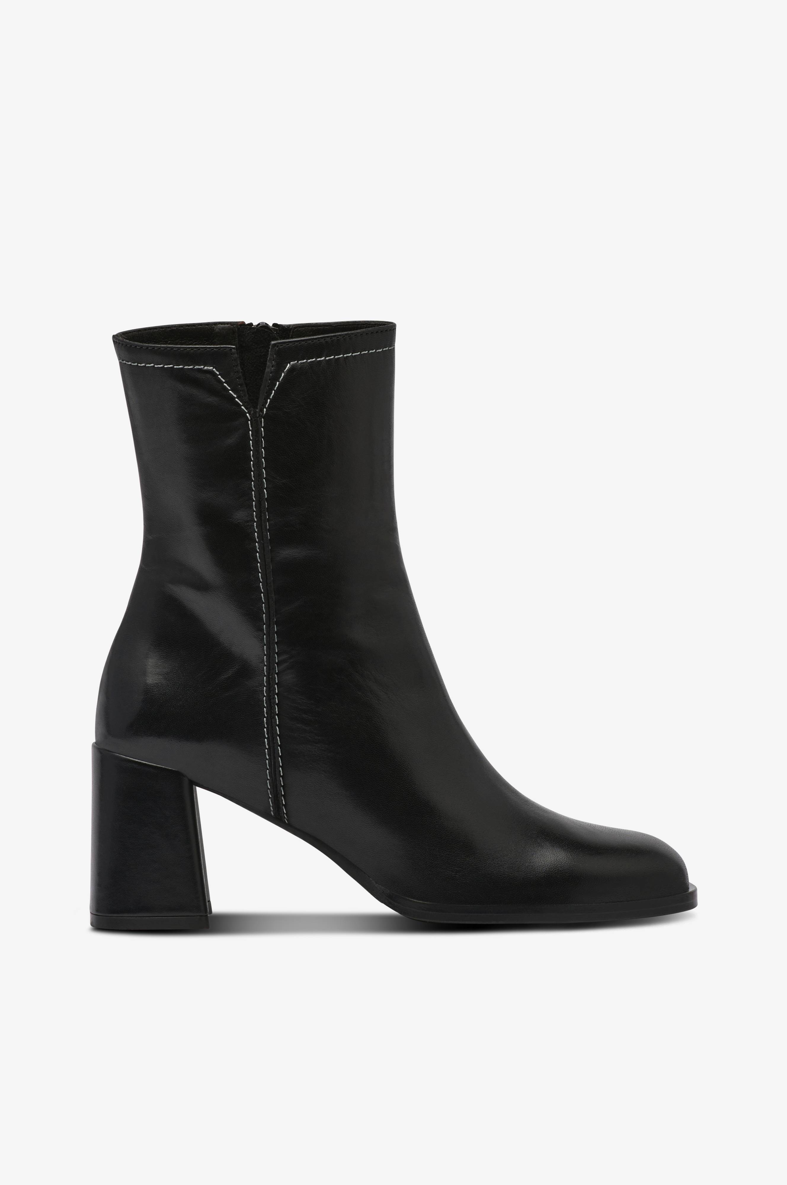 • Modell i skinn• Rett tå• Dekorstrikkede sømmer• Glidelås på innsiden av skaftet• Foring i skinn• Kledd kilehæl• Skafthøyde: 16,5 cm i størrelse 37• Hælhøyde: 7 cm