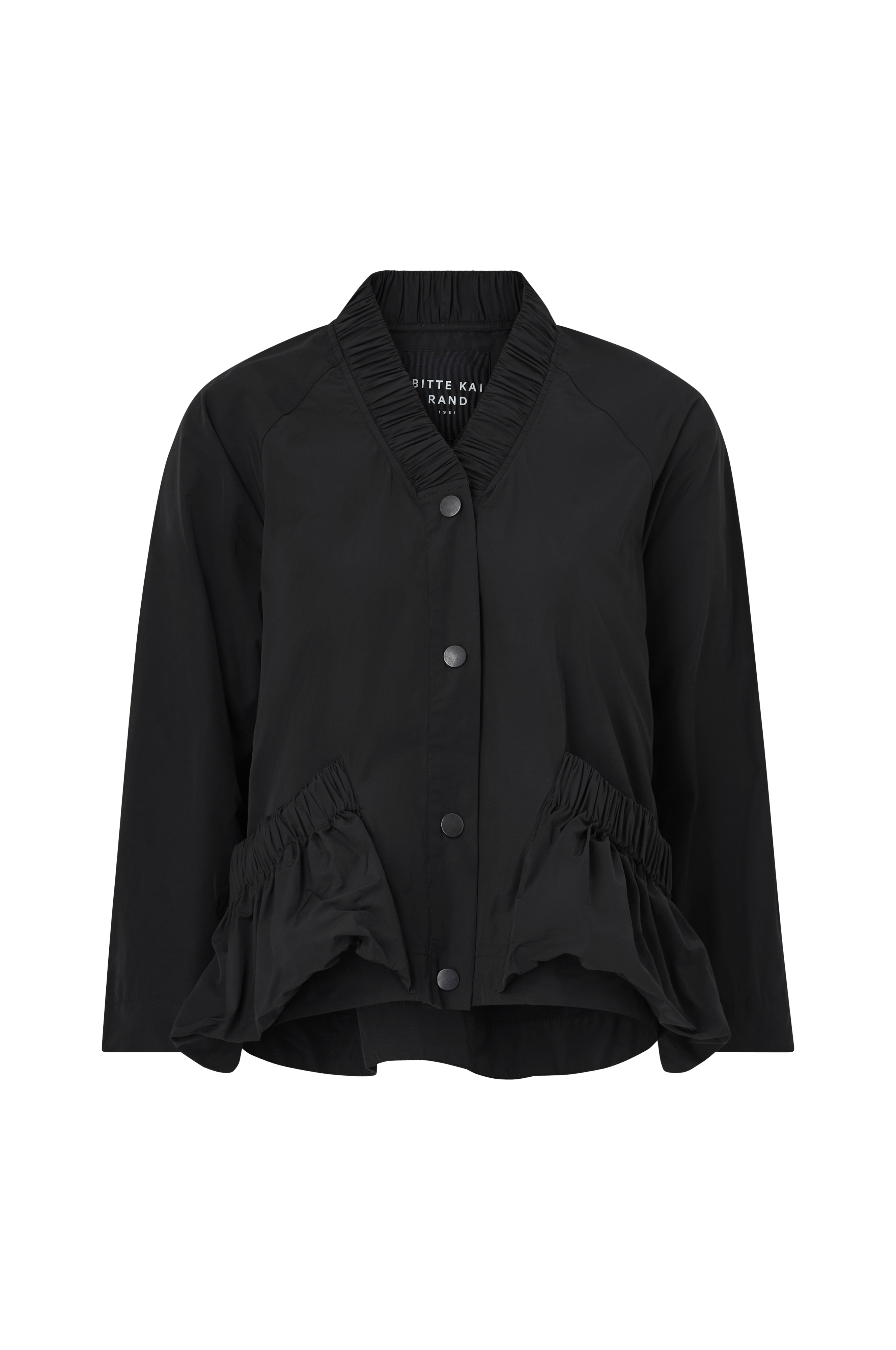 • Utsvingt, uformell modell• V-formet hals med innfelt gummistrikk• Rett, raglanskåret erme• Trykknapper foran• Store belglommeer med elastisk kant• Avrundet, lang hem bakpå• Ufôret• Lengde: 67 cm i størrelse S