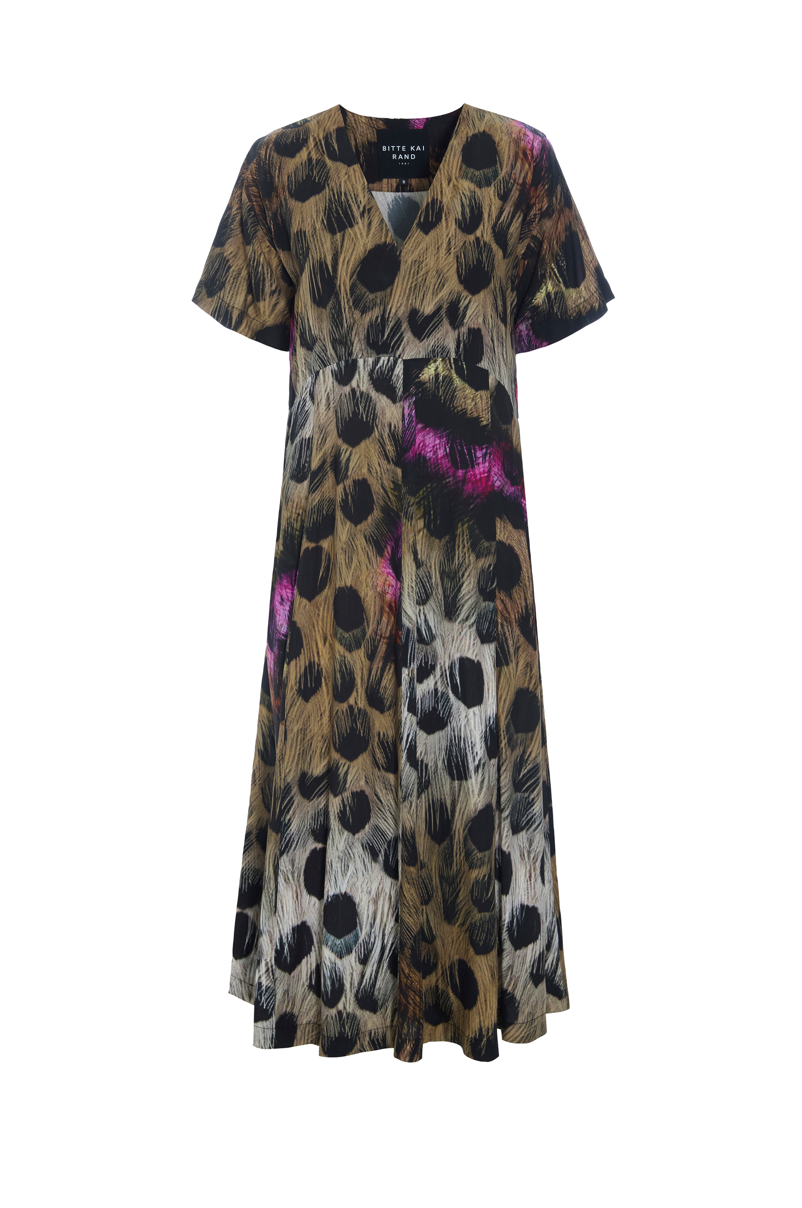 • Mønstret kjole i viskose• V-formet hals• Korte ermer• Utsvingt skjørt• Lengde: 129 cm i størrelse S