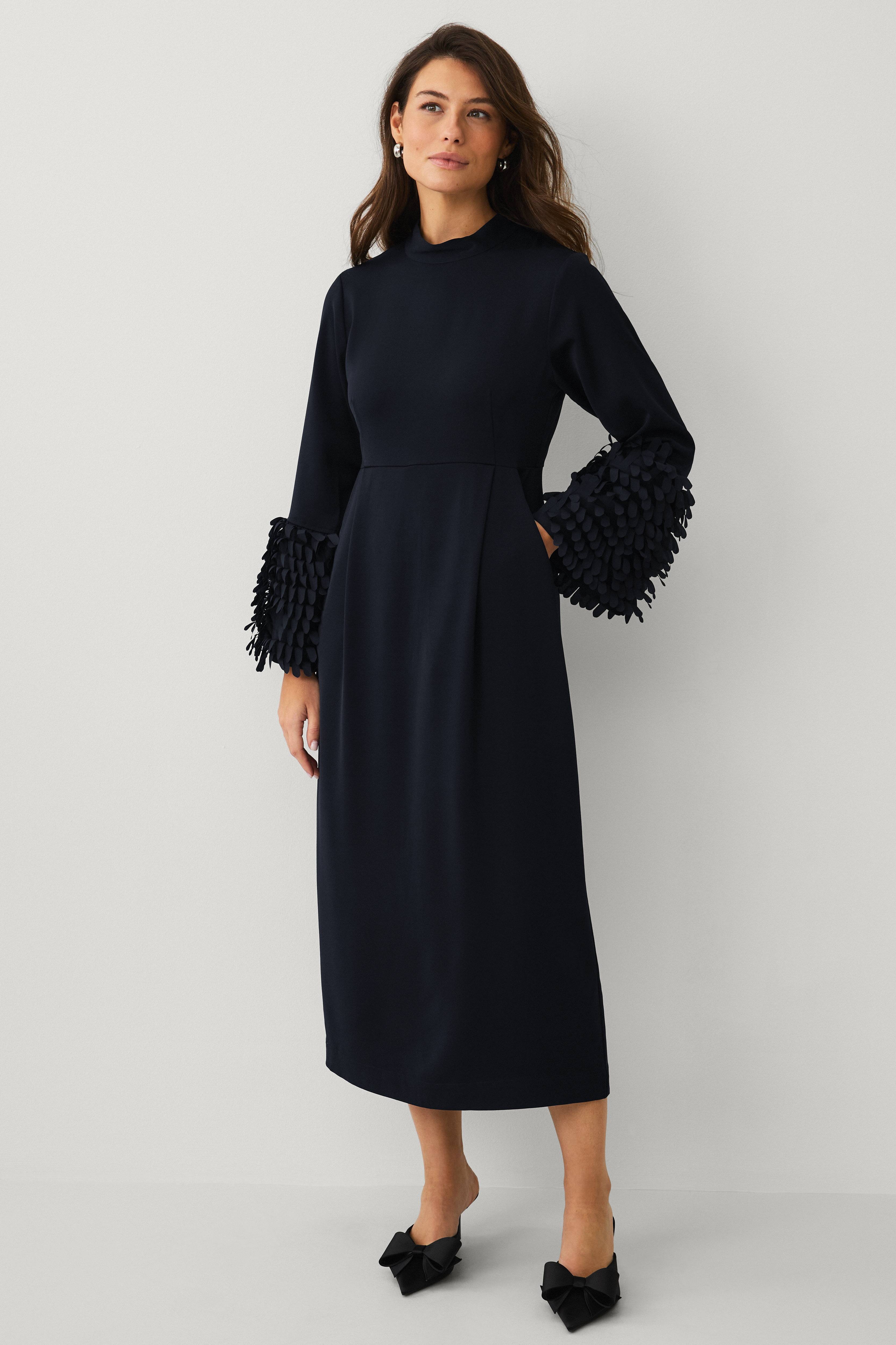 • Kjole med høy krage• Glidelåslukking i ryggen• Lange ermer• Dekorative bruksområder i ermeslutten• Sidelommer• Lengde: 128 cm i størrelse S
