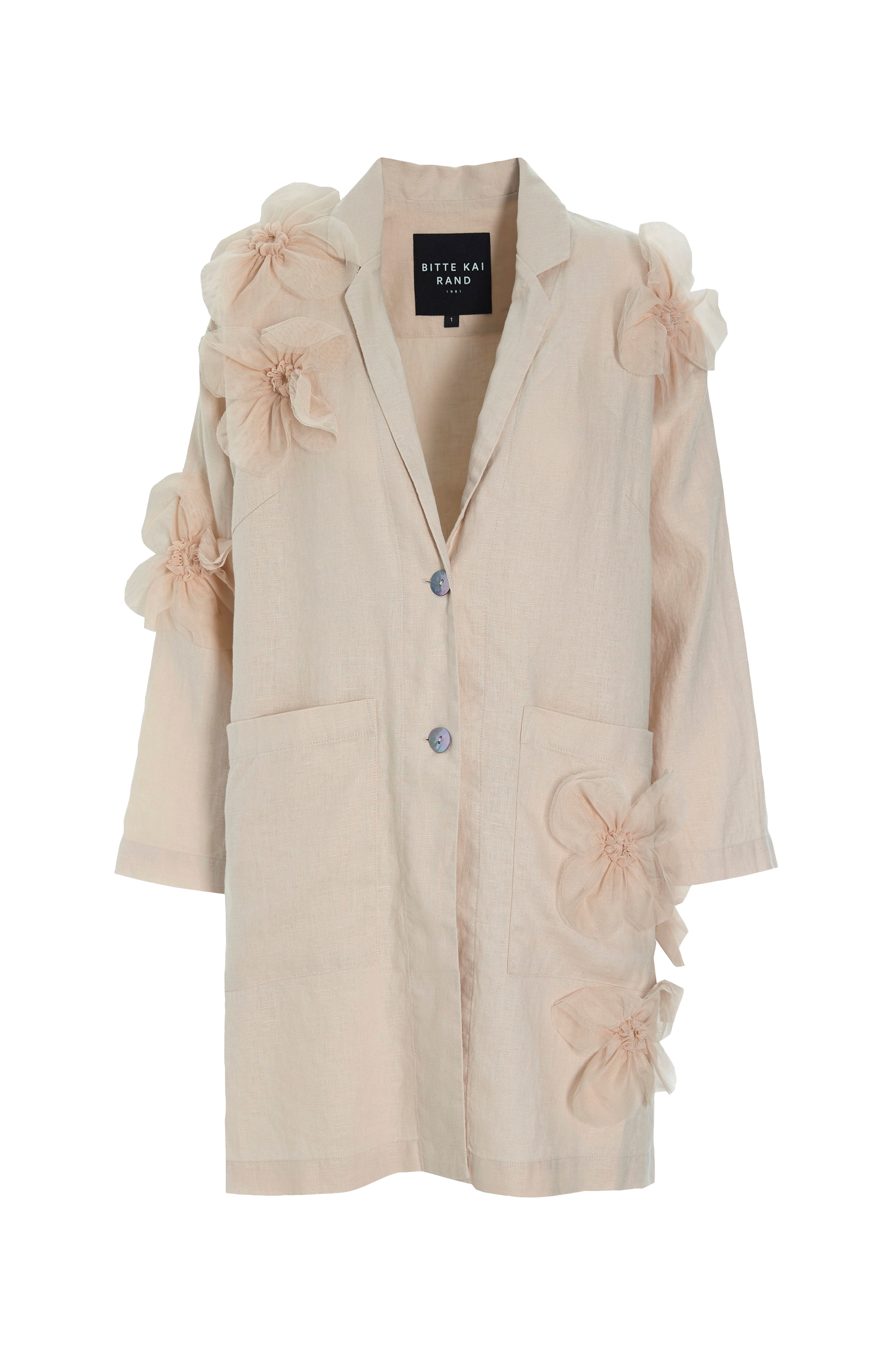 • Jakke i lin• To knapper med perlemorslook• To lommer• Dekorative, påsydde blomster i mesh rundt• Splitt i sidene• Lengde: 84 cm i størrelse 34/38