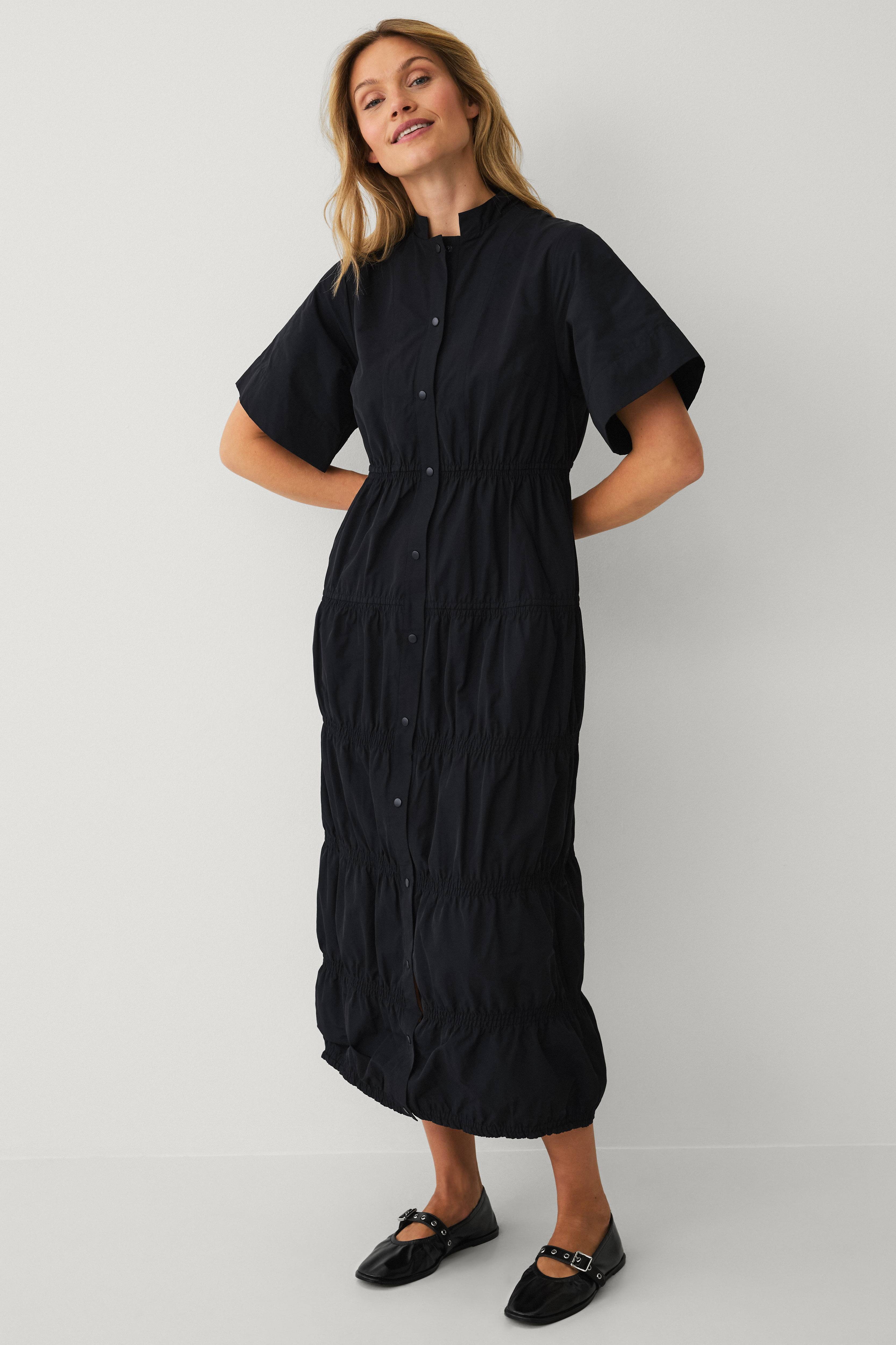 • Lang kjole i bomullsblanding• Knapper foran• Halvhøy høy krage• Korte ermer• Utsvingt modell med volanger• Sidelommer• Lengde: 132 cm i størrelse S