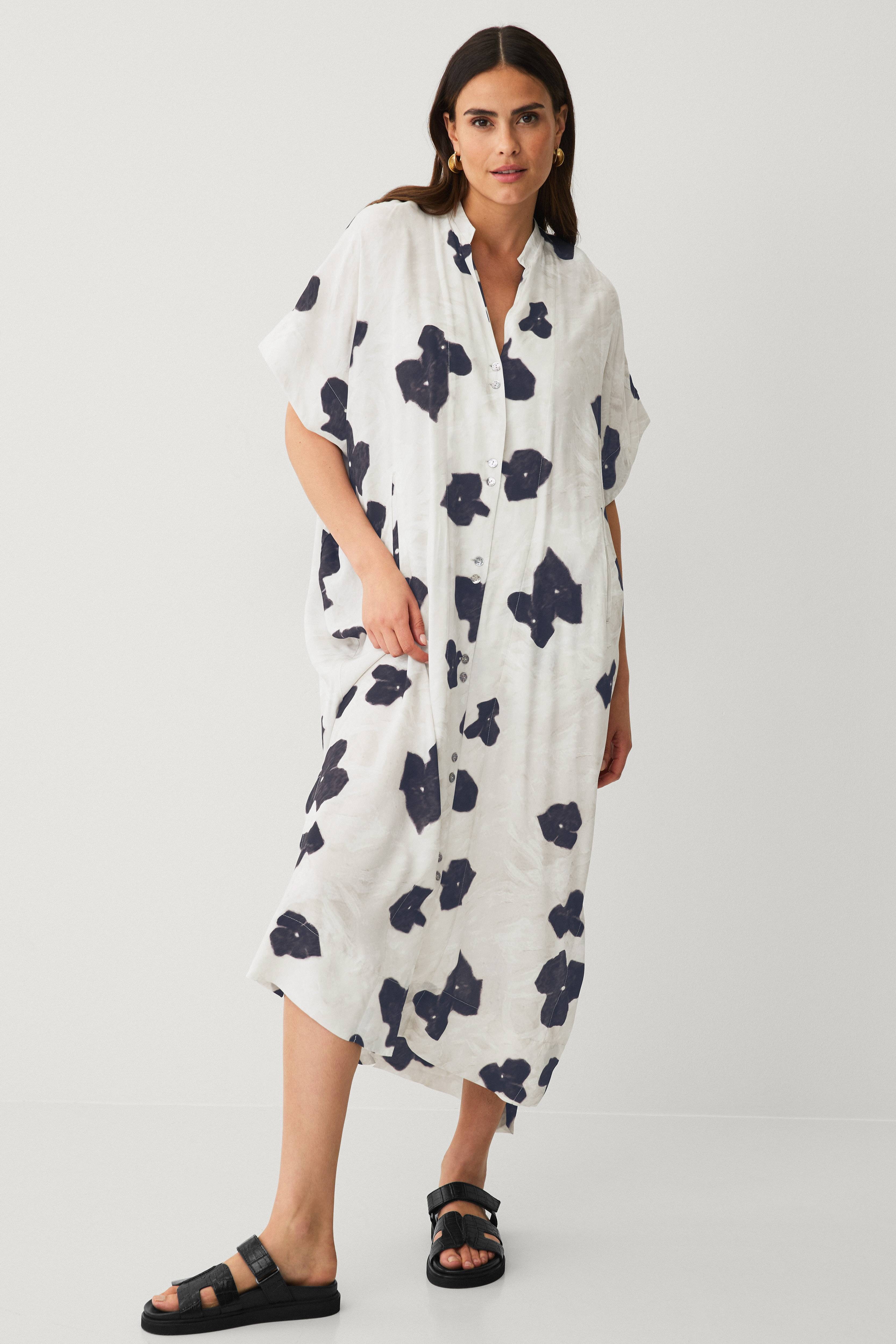 • Bred modell i viskose• V-hals snitt• Knapper hele veien fram• Utringet skulder med kort erme• Innfelte lommer• Skjær nede i sidene med lenger backing• Lengde: 130 cm i størrelse 34/38