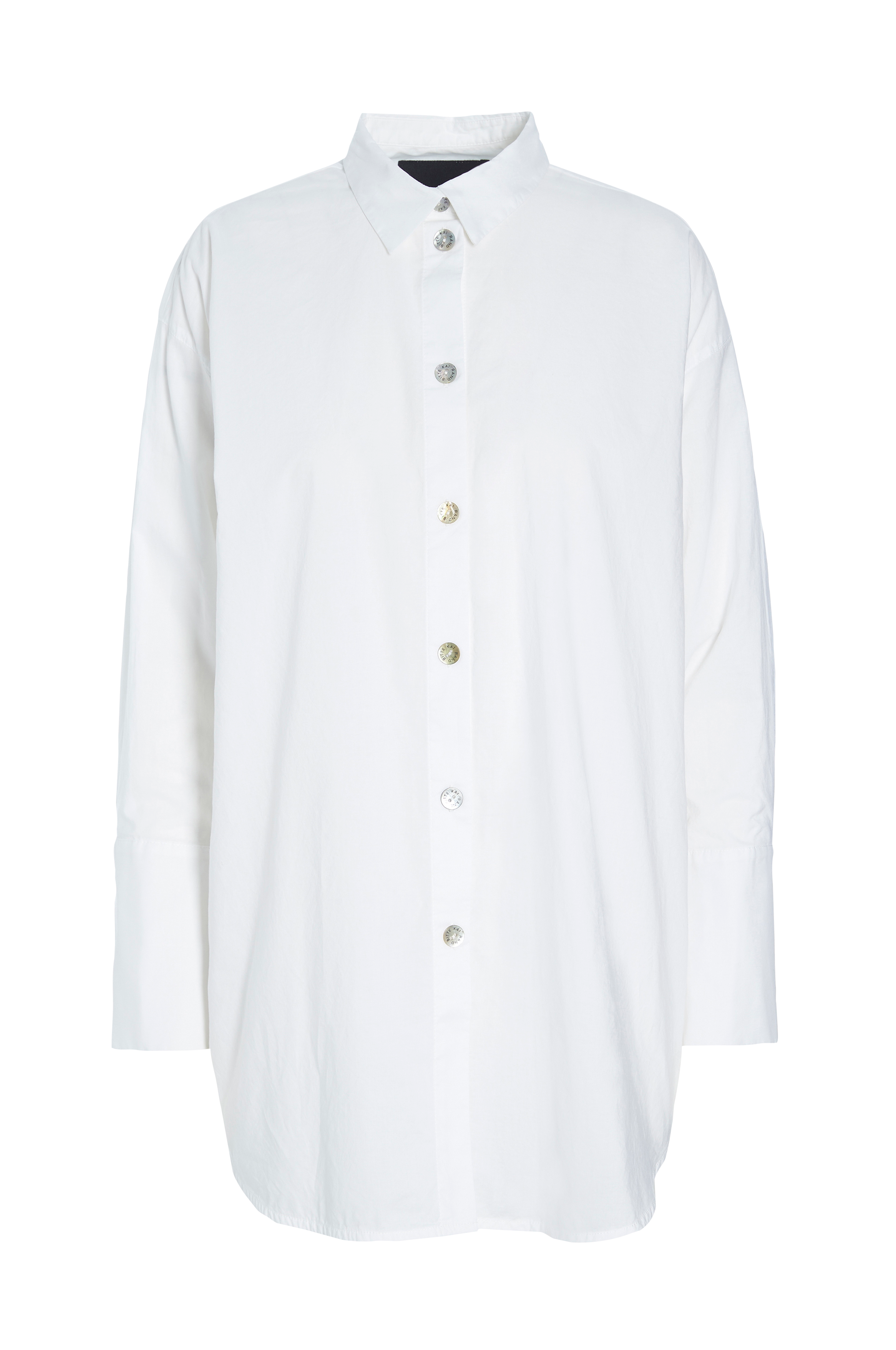 - Knapping i full lengde med perleknapper- Lange ermer med vide mansjetter- Skjortekrage- Avrundet for- og bakside