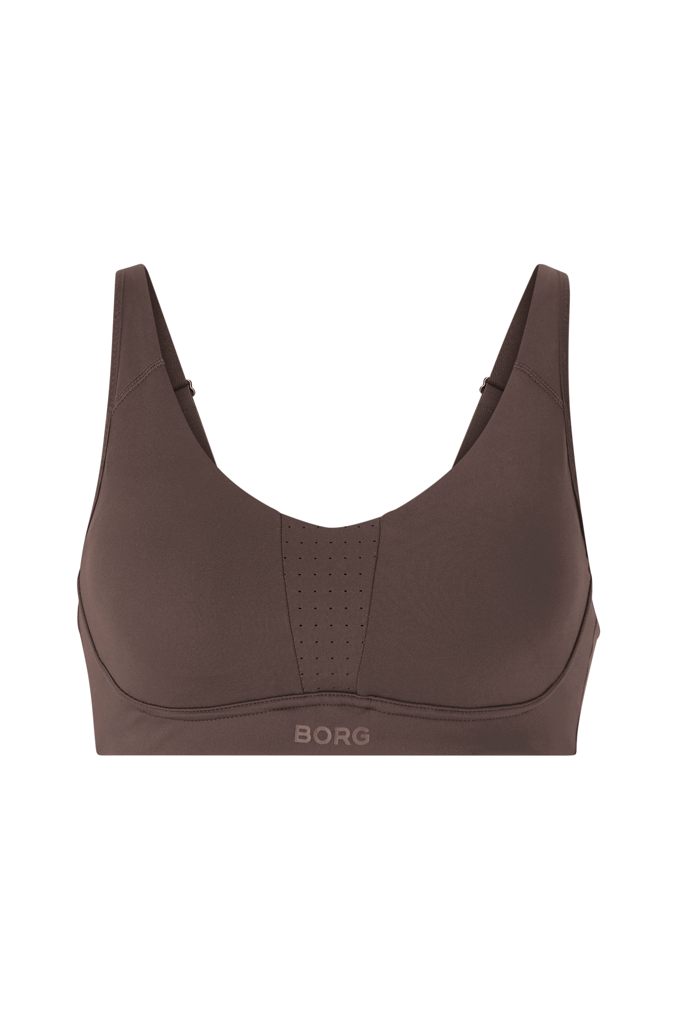 • Fullt foret sports-bh i mykt, stretchy, fullt forett materiale • Middels høy støtte • Polstre, avtagbar kopp • Justerbare sløyfer baktil med kroker • Gummistrikk i nedre kant • Pustende stoff • Perforert stoff midt foran for bedre ventilasjon • Justerbare og kryssbare skulderstropper