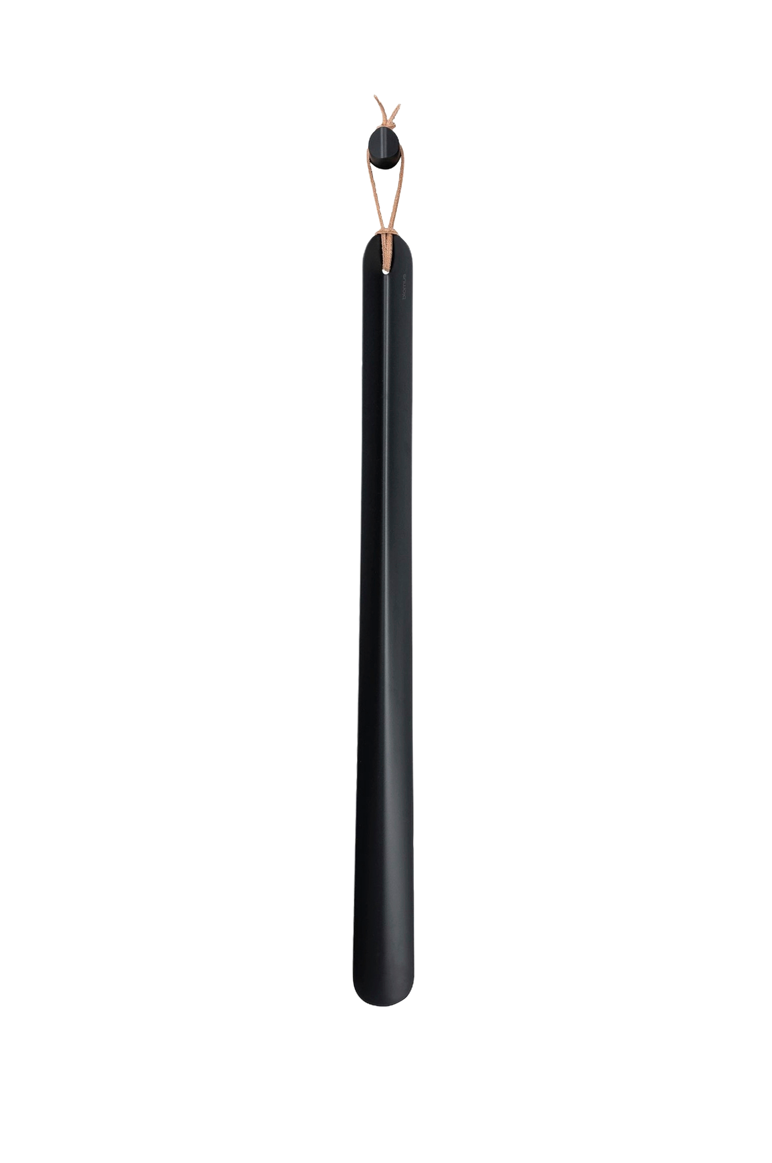 suko skohorn, designet av david meier, er laget av pulverlakkert stål av høy kvalitet og gjør det til en behagelig opplevelse å ta på seg skoene. Den enkle v-formede designen sikrer optimalt grep. Den svakt avsmalnende v-formen gjør at føttene glir uanstrengt inn i skoene. Stroppen i naturskinn og den matchende veggkroken i samme design gir suko skohorn et kunstnerisk preg på veggen.