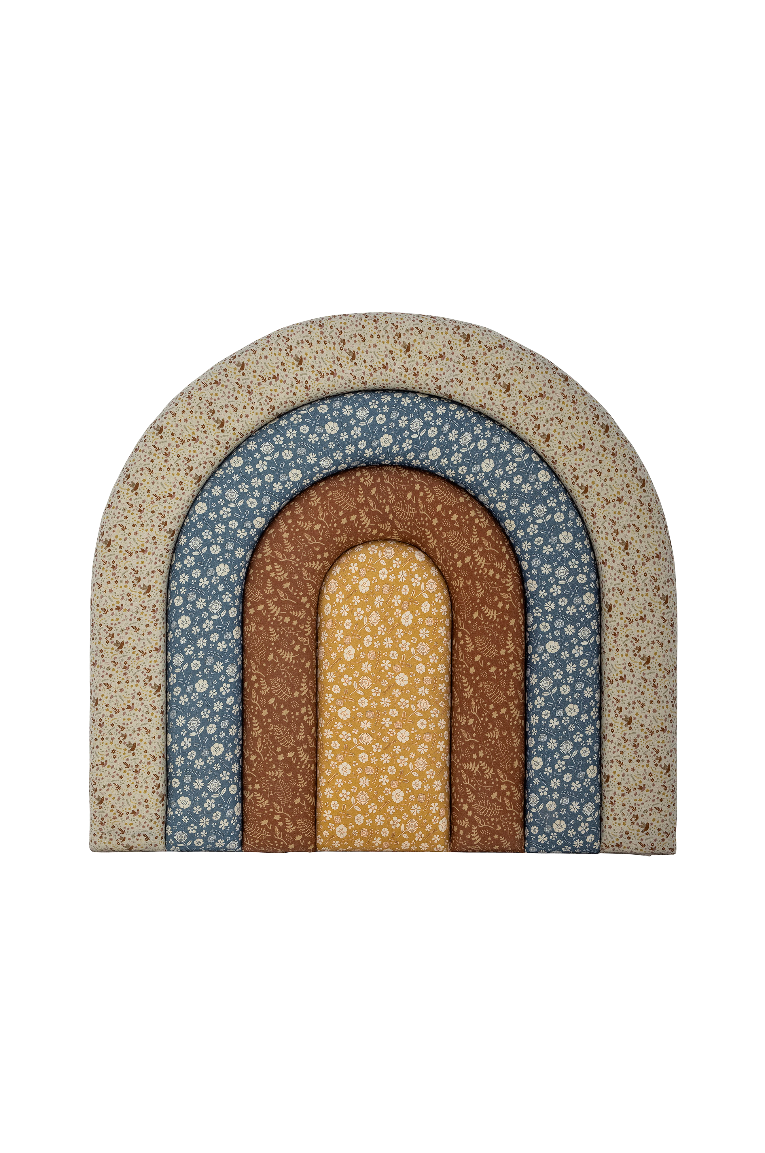 Jo sengegavl fra Bloomingville MINI er et must på barnerommet! Sengegavlen er formet som en regnbue, med bomullsstoff i ulike blomstermønstre, i varme og myke farger. Buen har myk stopp, noe som gjør den behagelig for ryggen. Den er klar til å monteres på veggen. Plate av MDF.