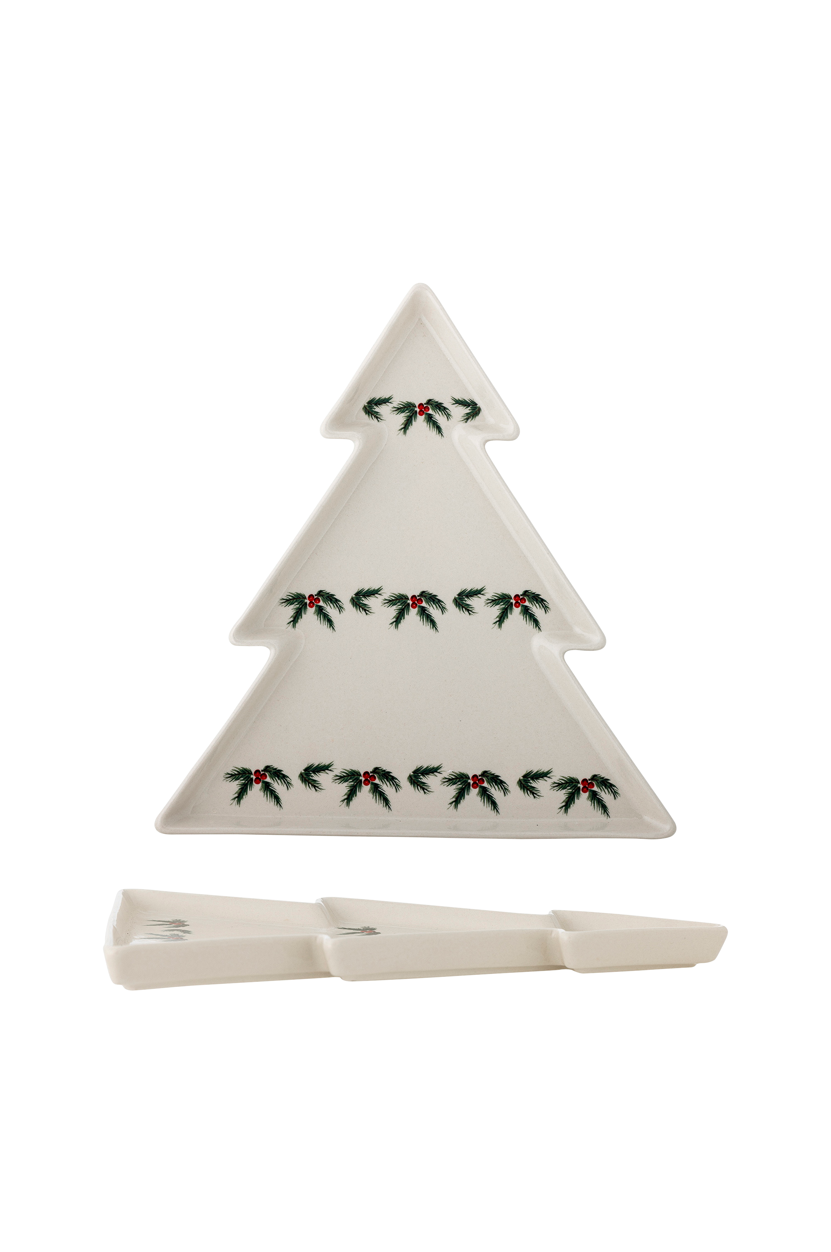 Berry Serving Plate fra Bloomingville er formet som et juletre og er laget av steintøy, og er et sjarmerende fat prydet med et trykt julemotiv. Det nøytrale og elegante designet gjør det enkelt å integrere med eksisterende julepynt, og er ideelt til å presentere alt fra festlige forretter til julekaker.