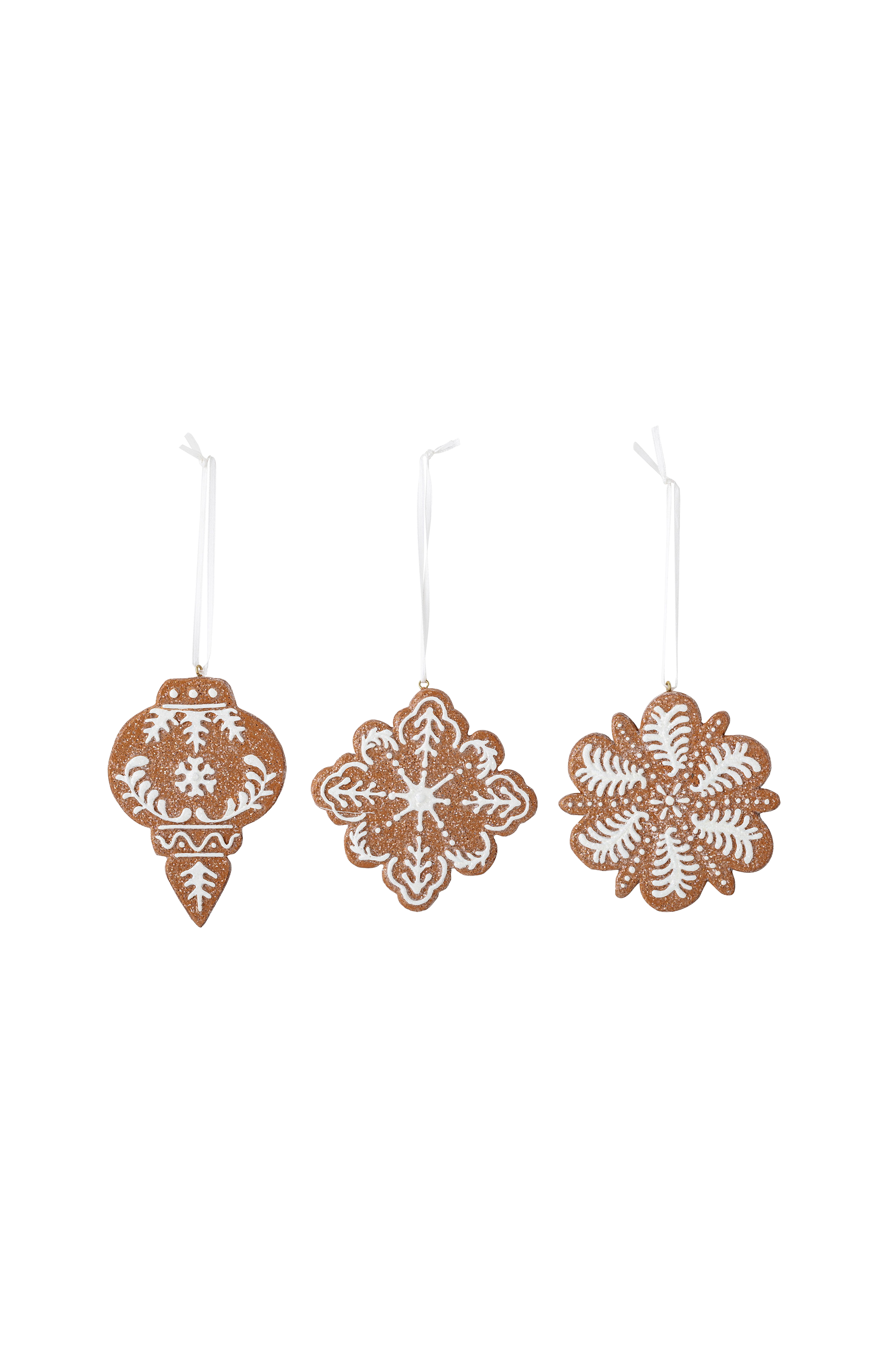 Dette vakre settet med Pearl juletrepynt fra Bloomingville er av polyresin og dekorert som pepperkaker med glasur. Pynten gnistrer og er perfekte i juletreet, men også fine som dekor i en skål på bordet. Settet inneholder tre pyntegjenstander. Mål: L10xH0,6xB9 cm.