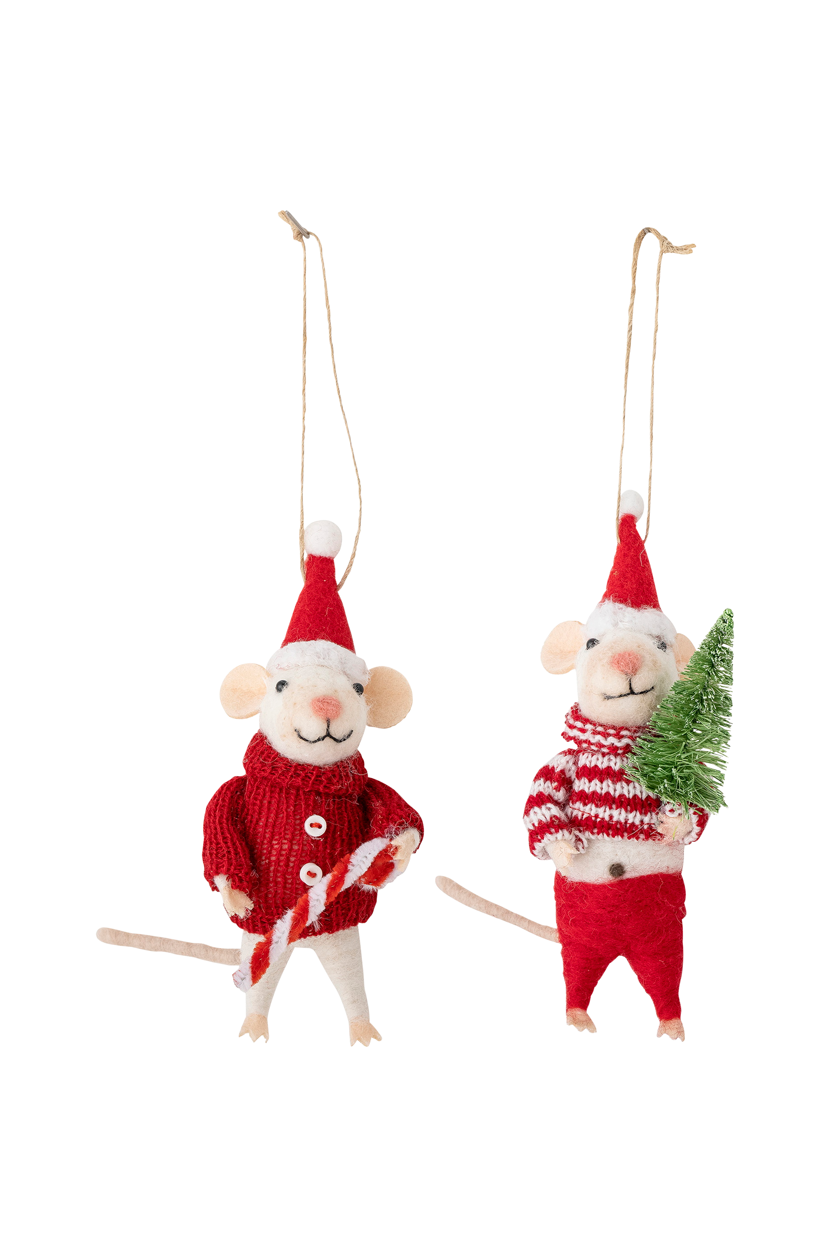 Peo pynt fra Bloomingville er et vakkert par med to dekorative pyntemus, kledd for julen. Heng dem i juletreet eller bruk dem som dekor ved andre anledninger. Pyntegjenstandene er produserte av ull og har mange små, fine detaljer. L8xH12xB8/L6,5xH12xB8 cm, 2-pk