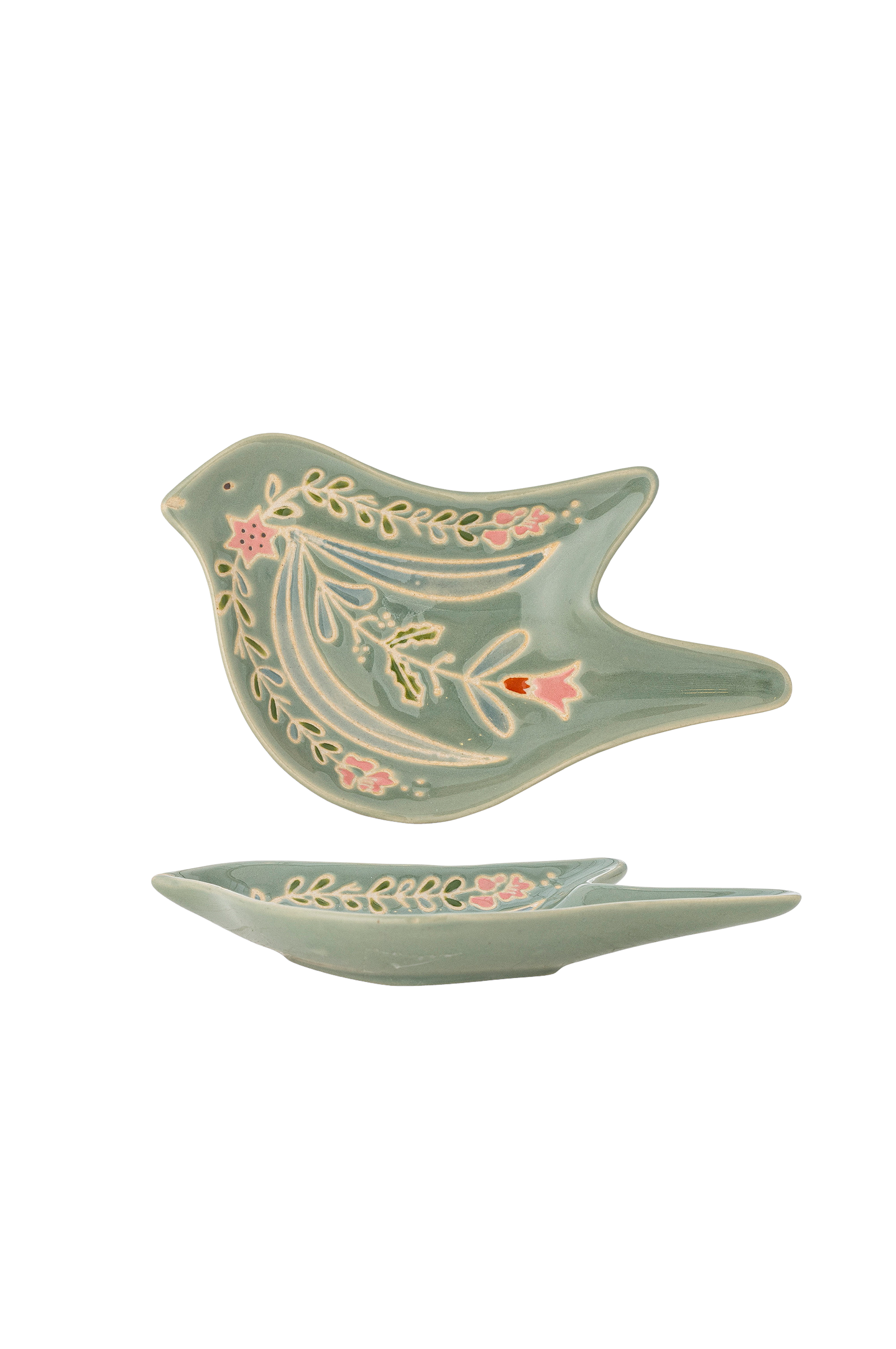Rosalynde serveringstallerken fra bloomingville er et fugleformet fat i steintøy, håndmalt med blomsterdetaljer. Små variasjoner i mønster og intensitet kan forekomme, noe som gjør hvert eksemplar unikt.