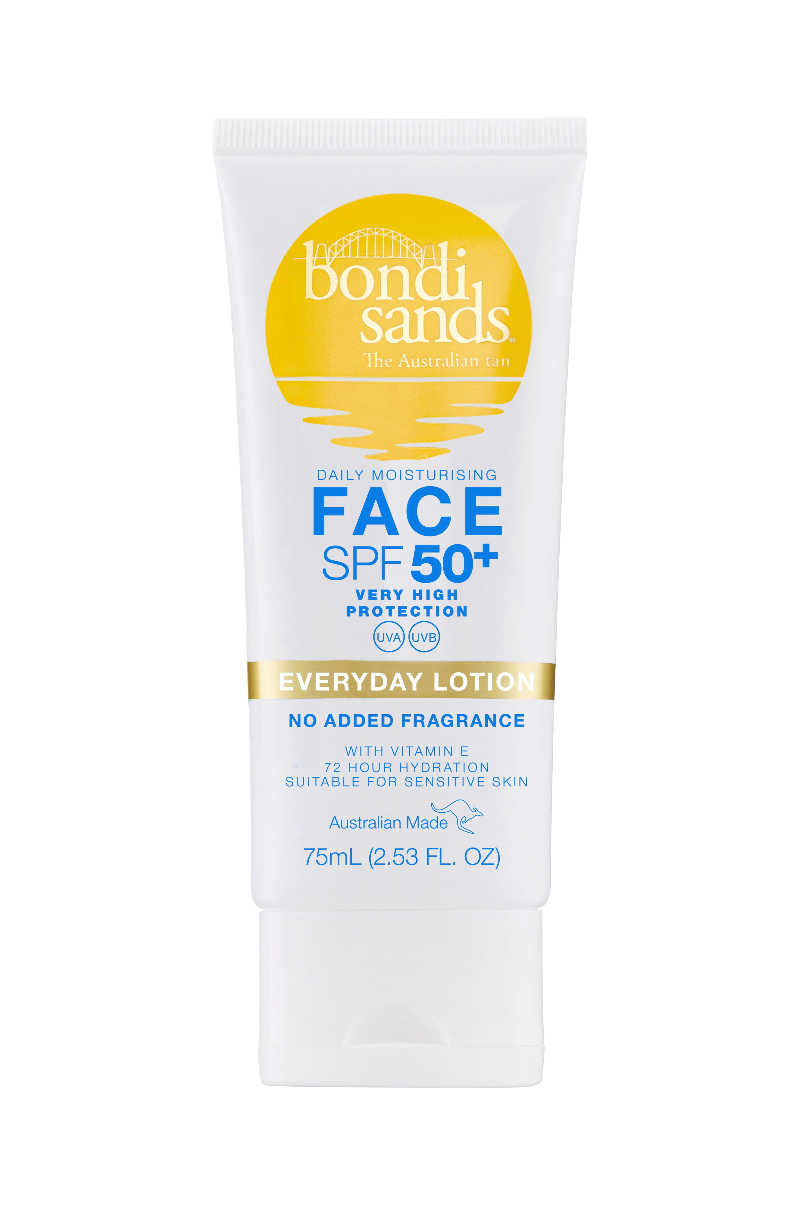 Sommeren er her! Nyt en solfylt dag på Bondi Sands måte med vår Everyday Spf 50+ Face Sunscreen Lotion. Den vannbestandige formelen vår gir beskyttelse på Uva og Uvb, og er skånsom, absorberes raskt og tørker inn til en usynlig, ikke-fettete finish. Formulert for å gi opptil 72 timers fuktighet, tilsatt aloe vera og vitamin E for å gi huden en fuktighetsgivende følelse. Kan brukes alene eller under sminke. Dermatologisk testet. Egnet for sensitiv hud. Ikke komedogen - tetter ikke porene."
