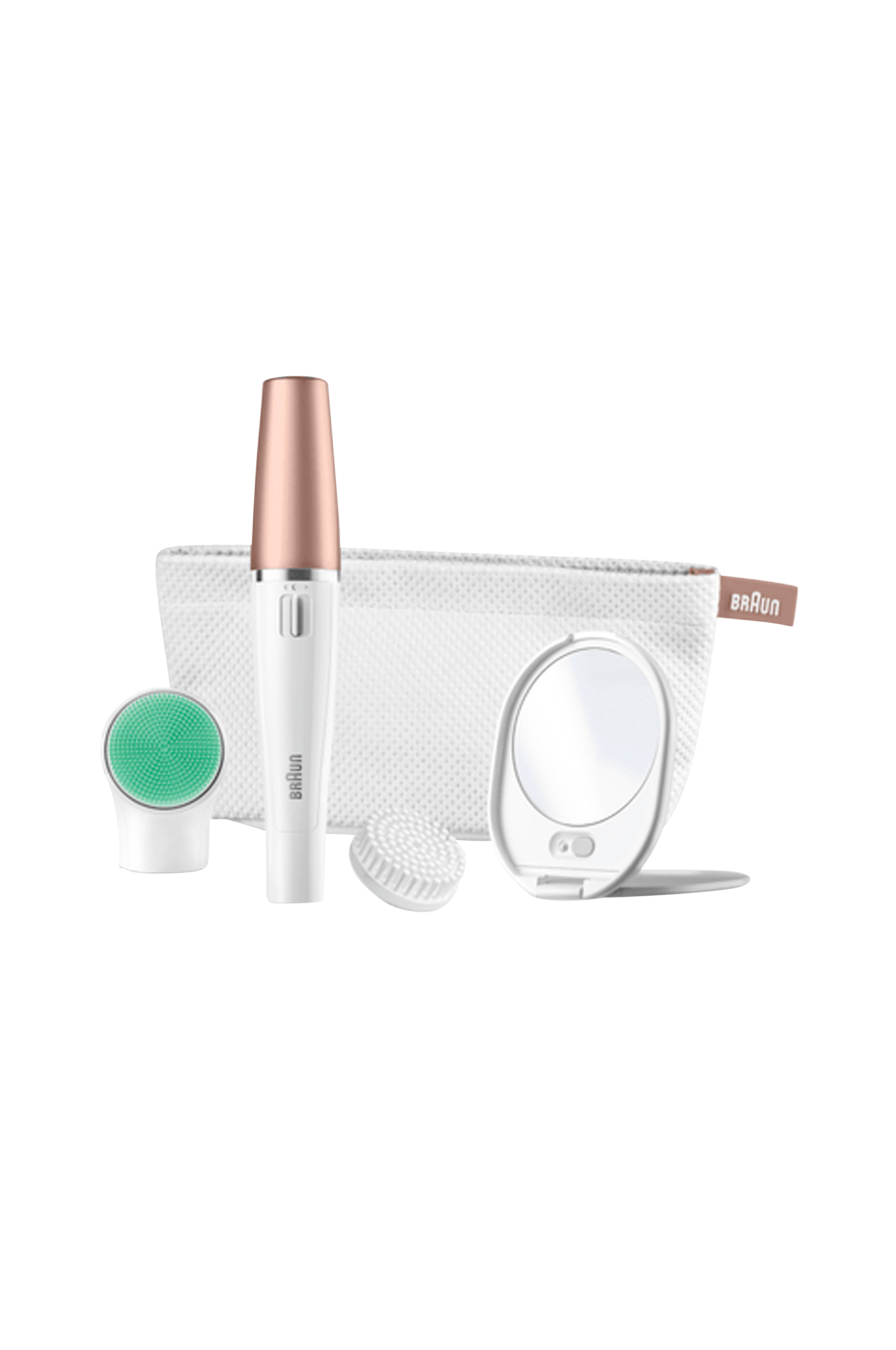 Pakken inneholder- Epilator for ansiktet- Hudpleiende pute- Børstehode- Belyst speil- Oppbevaringsveske- 1 x AA-batteri