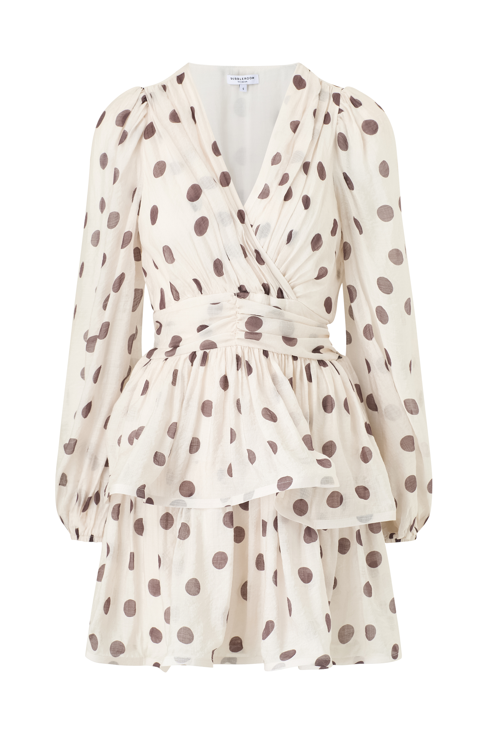 • Fôret kjole med lange ballongermer• V-formet, skjøtt hals• Vaffelsøm i midjen bak• Volanger på bunnen• Lengde: 86 cm i størrelse S