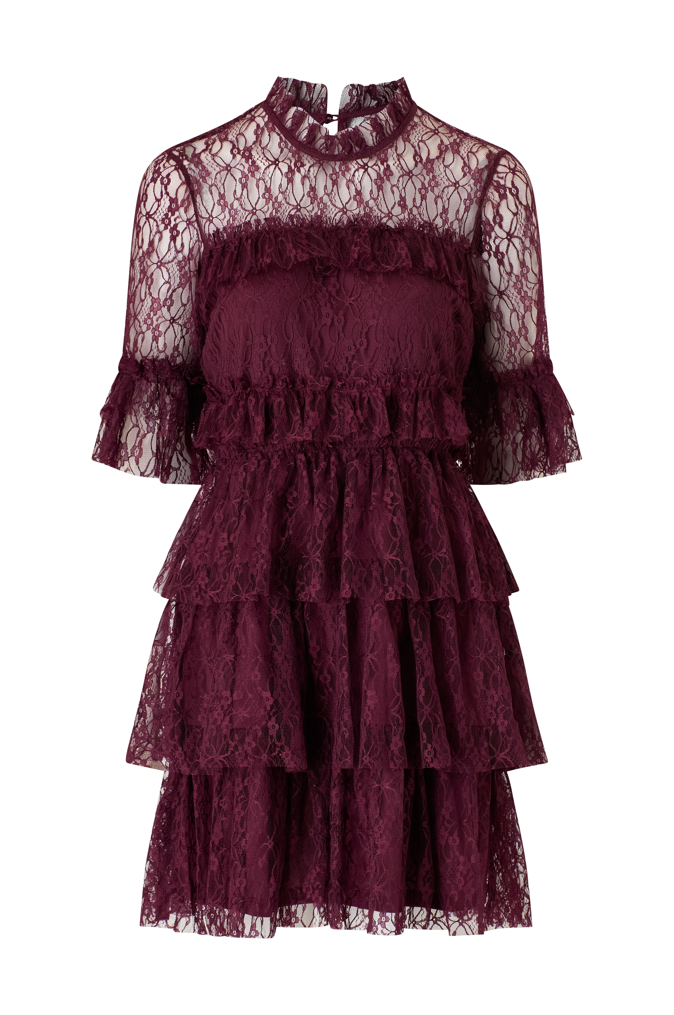 • Kort, fôret blondekjole med volanger rundt• Rund hals med blondekrage• Nøkkelhulsåpning med kledd knapp i nakken• Halvlange ermer• Elastisk utskjæring ved midjen• Lengde: 94 cm i størrelse 36
