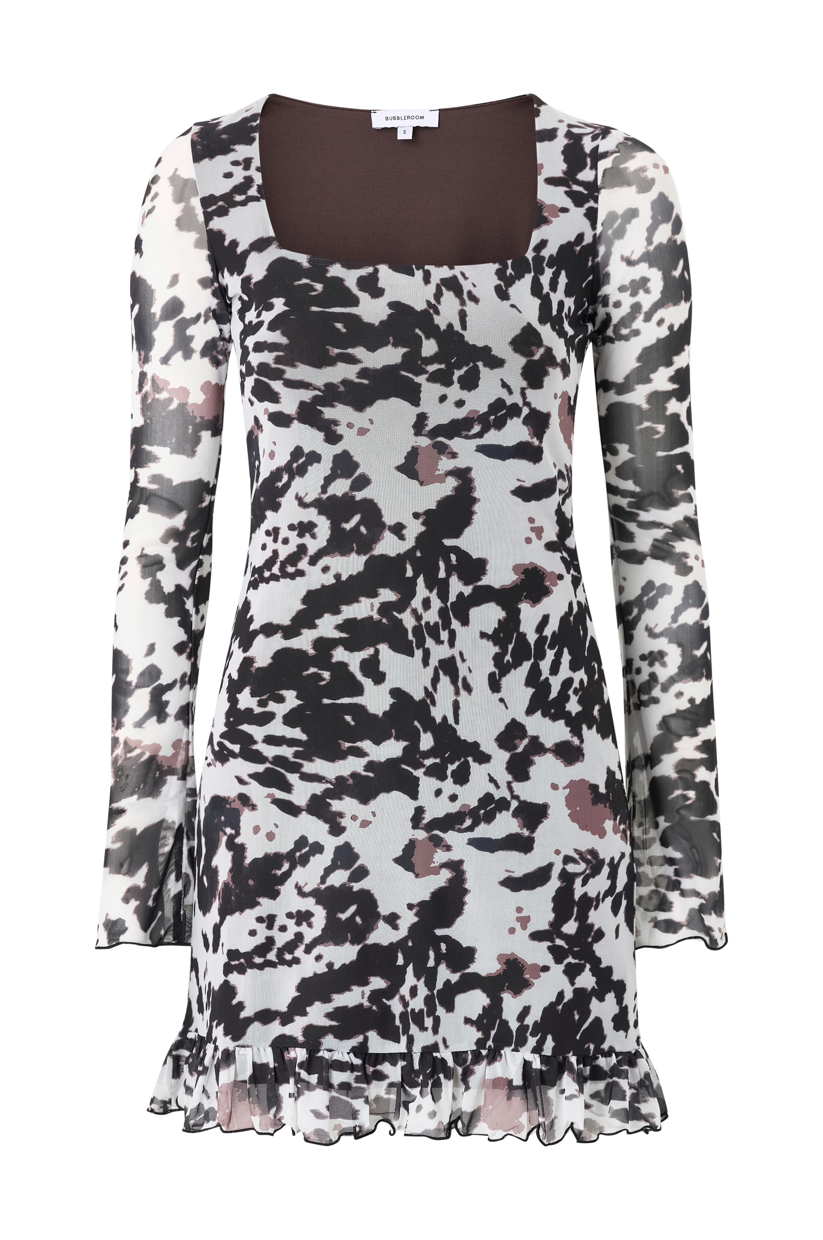 • Kort, halvtransparent kjole i mesh• Dyp utringning• Lange ermer• Figurnær passform passform• Volangkant på bunnen• Fôret• Lengde: 87 cm i størrelse S