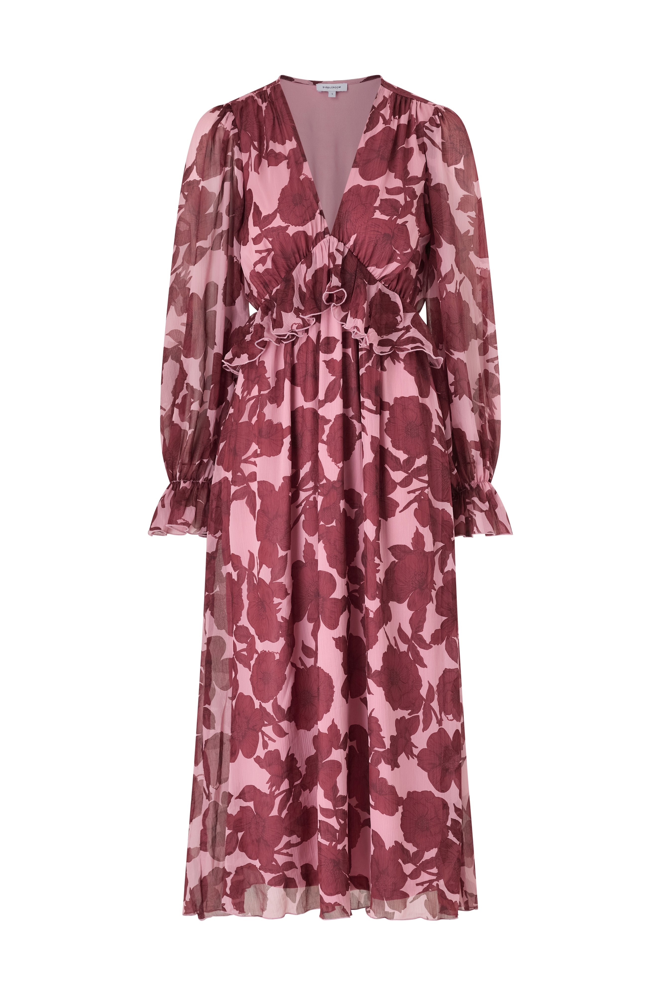 • Fôret kjole i chiffon• Volang midt foran og rundt• Gummistrikk ved midjen• Lange ermer• Gummistrikk med volang i ermeslutten• V-ringning• Lengde: 132 cm i størrelse S
