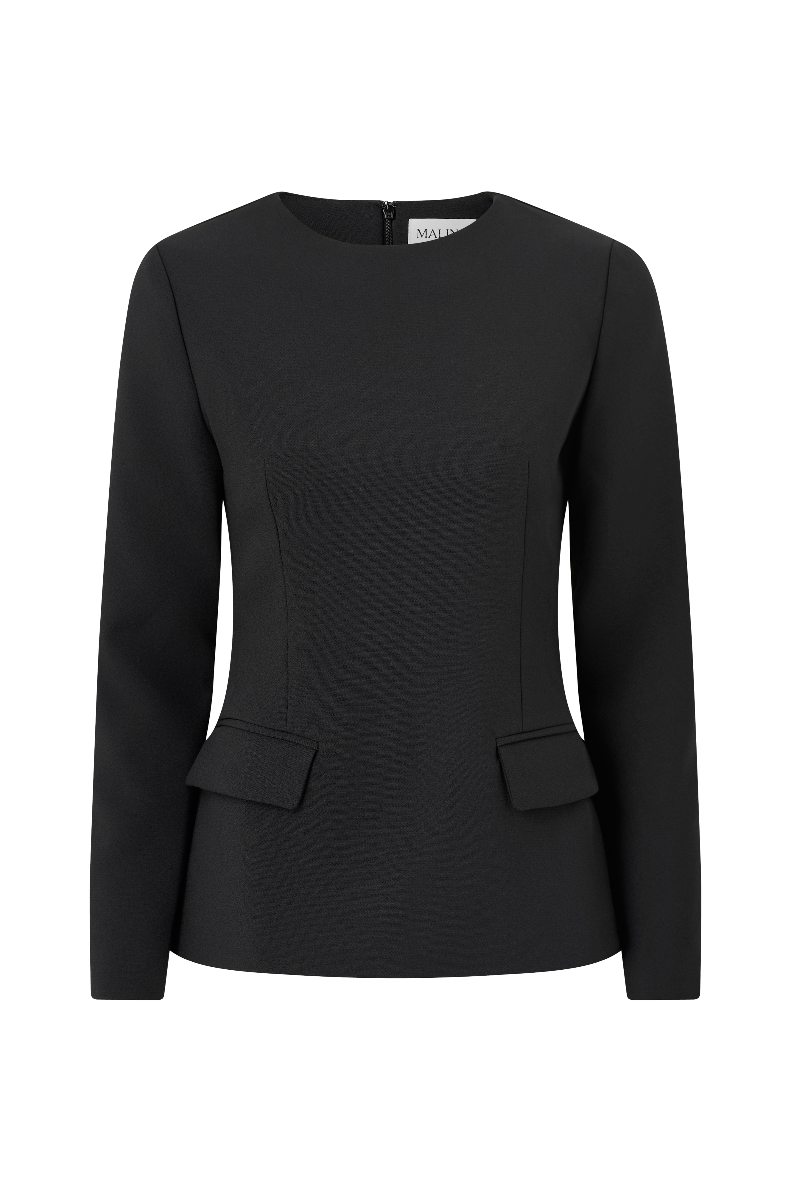• Skreddersydd bluse med definert midje• Rund hals• Skuldre• Lange ermer med splitt ved armenden• To lommer med lokk foran• Skjult glidelås i ryggen• Ettersittende passform
