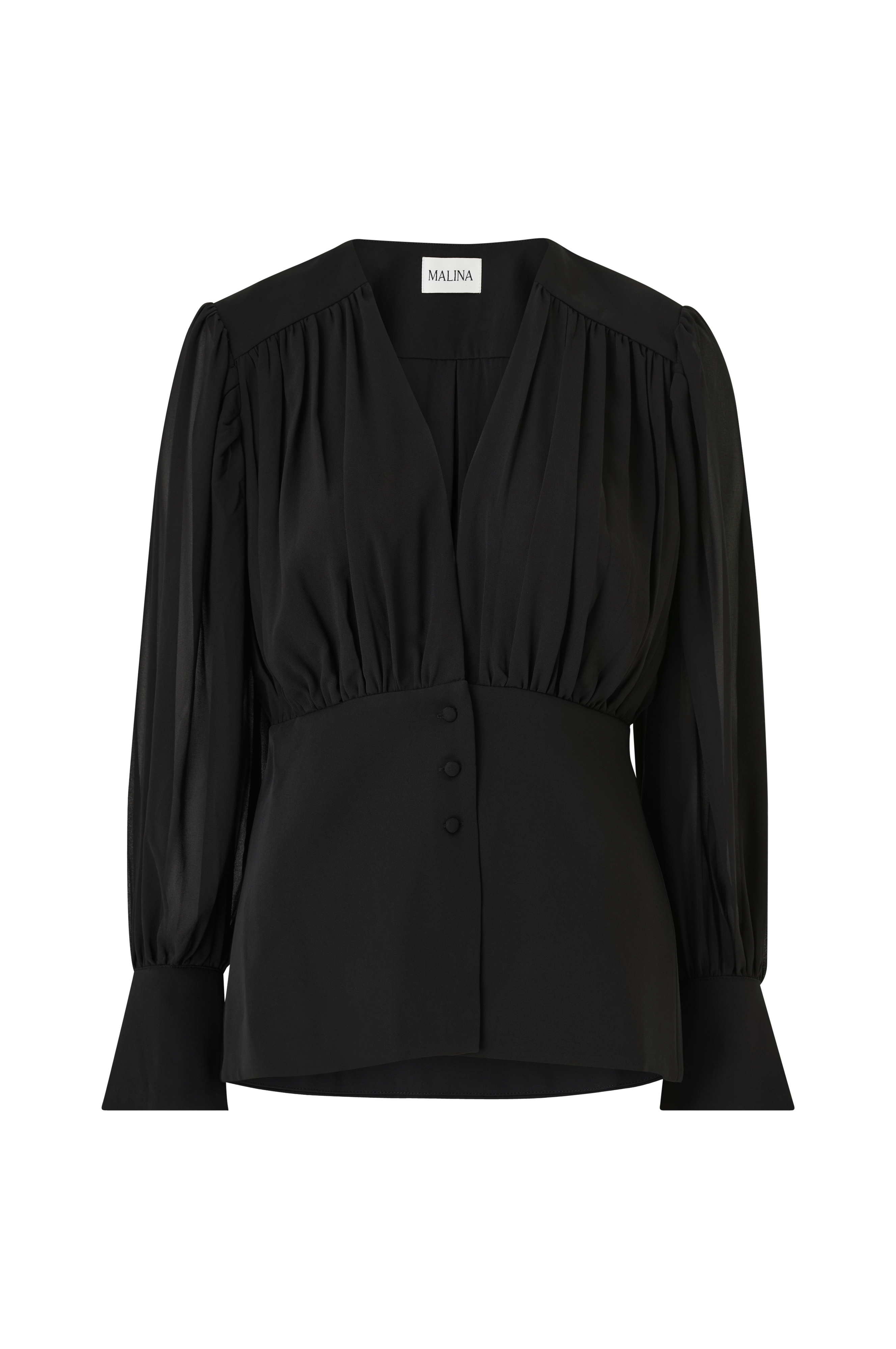 • Figurformet modell• Drapering i chiffon på toppen• Dypt v-hals snitt• Definert midje med utsvingt nedre del og kledde knapper• Langt erme med bred mansjett