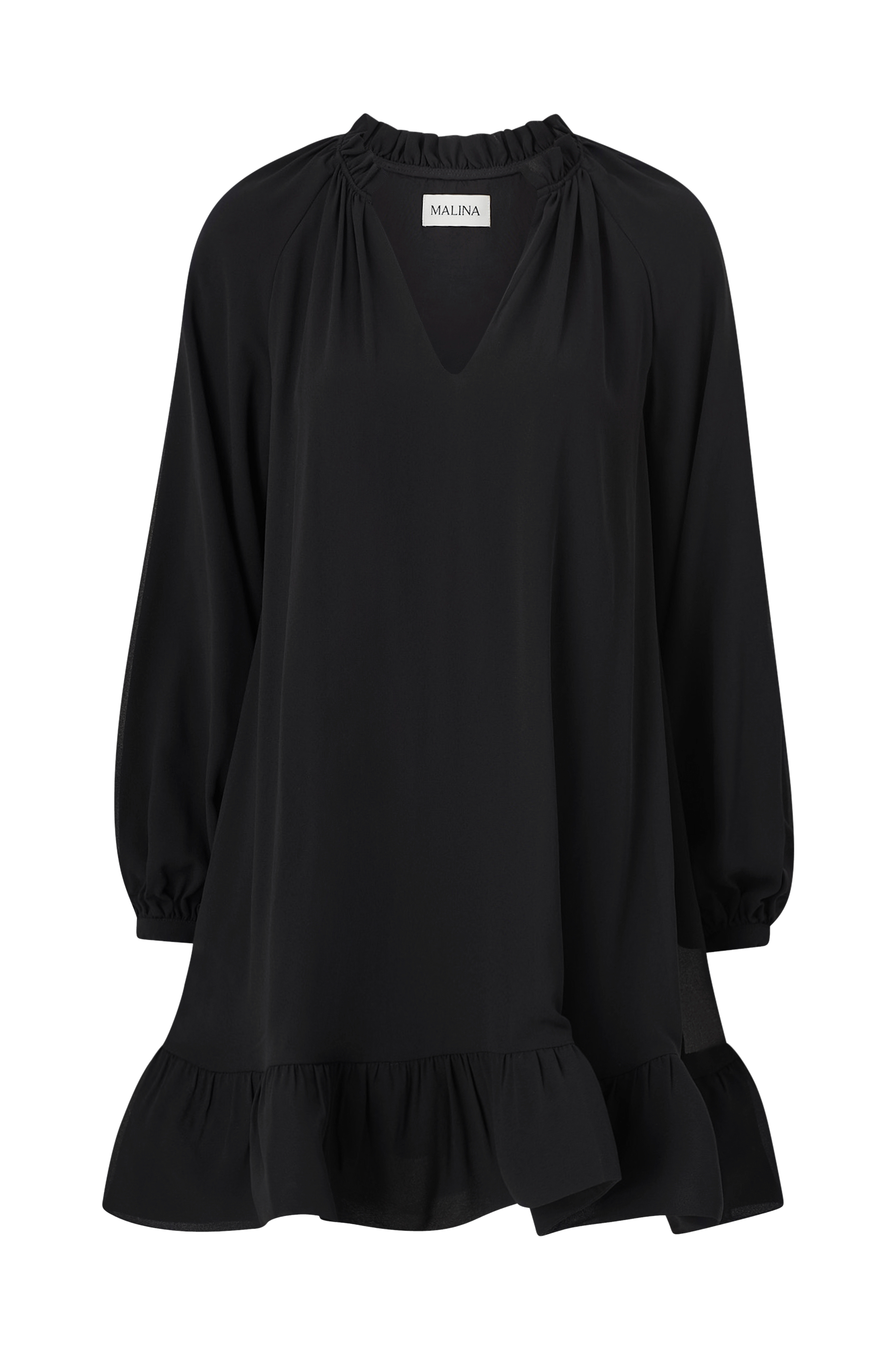 • Utsvingt, bred modell i chiffon• Rund hals med volangkant og v-hals snitt foran• Ekstra langt, bredt erme med tynn mansjett• Hard volang i nedre kant• Lengde: 89 cm i størrelse 36